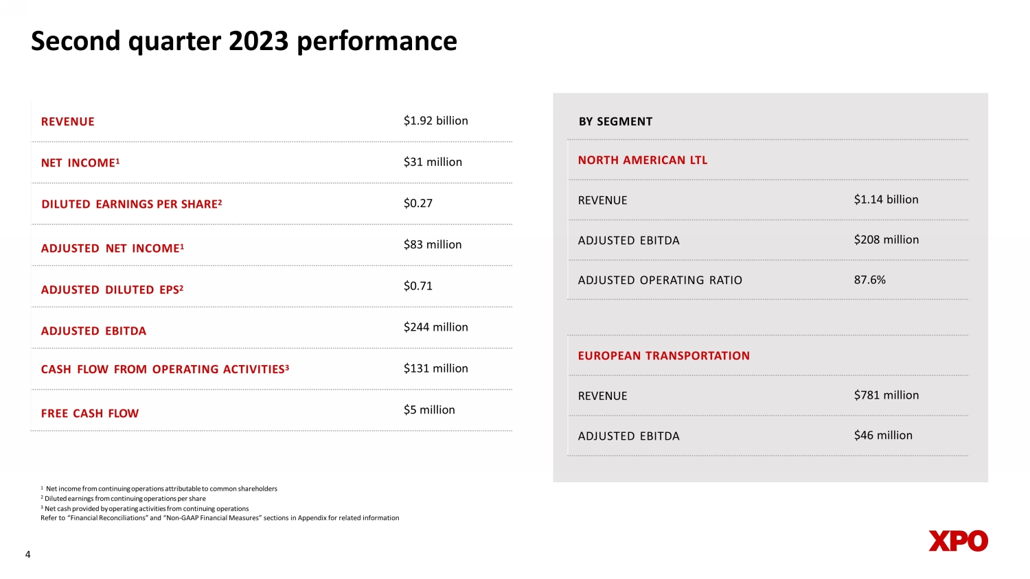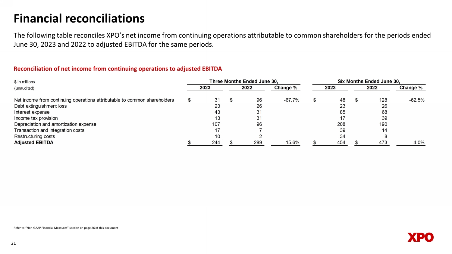 Financial reconciliations The following table reconciles XPO’s net income from continuing operations attributable to common shareholders for the period s e nded June 30, 2023 and 2022 to adjusted EBITDA for the same periods. 21 Reconciliation of net income from continuing operations to adjusted EBITDA $ in millions (unaudited) Change % Change % Net income from continuing operations attributable to common shareholders $ 31 $ 96 -67.7% $ 48 $ 128 -62.5% Debt extinguishment loss 23 26 23 26 Interest expense 43 31 85 68 Income tax provision 13 31 17 39 Depreciation and amortization expense 107 96 208 190 Transaction and integration costs 17 7 39 14 Restructuring costs 10 2 34 8 Adjusted EBITDA $ 244 $ 289 -15.6% $ 454 $ 473 -4.0% Three Months Ended June 30, Six Months Ended June 30, 2023 2022 2023 2022 Refer to “Non - GAAP Financial Measures” section on page 26 of this document