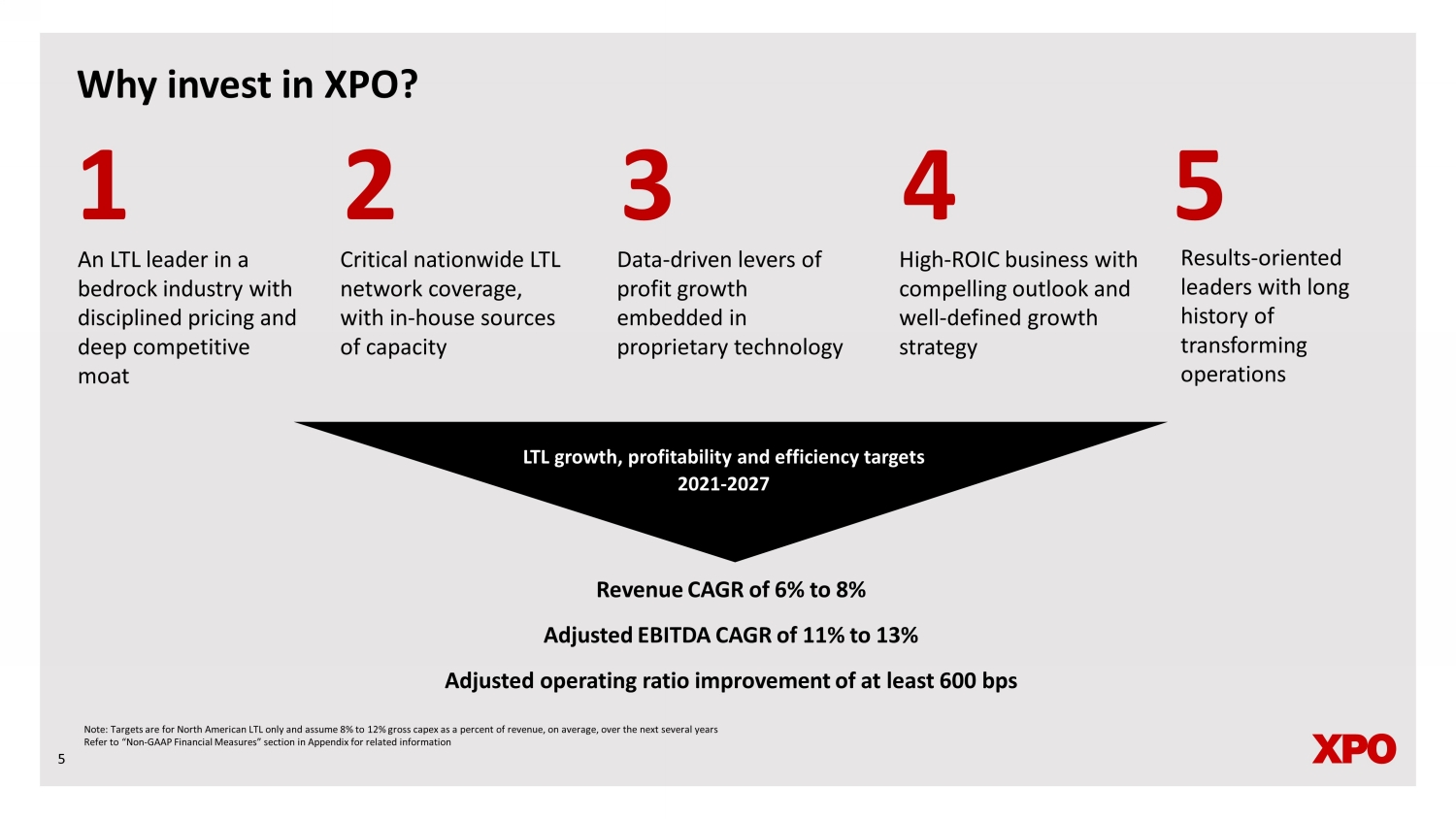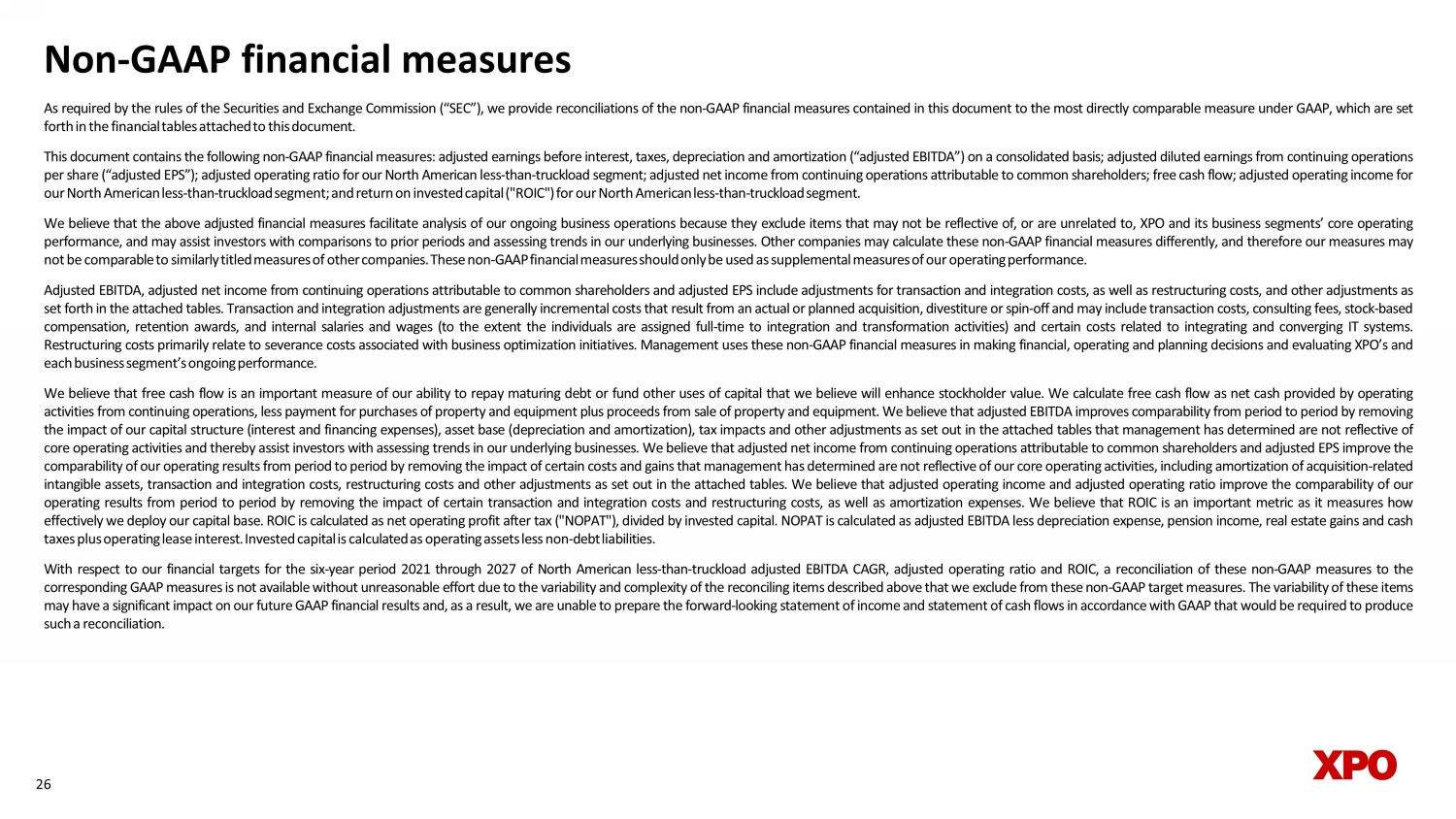 Non - GAAP financial measures As required by the rules of the Securities and Exchange Commission (“SEC”), we provide reconciliations of the non - GAAP financial measures contained in this document to the most directly comparable measure under GAAP, which are set forth in the financial tables attached to this document . This document contains the following non - GAAP financial measures : adjusted earnings before interest, taxes, depreciation and amortization (“adjusted EBITDA”) on a consolidated basis ; adjusted diluted earnings from continuing operations per share (“adjusted EPS”) ; adjusted operating ratio for our North American less - than - truckload segment ; adjusted net income from continuing operations attributable to common shareholders ; free cash flow ; adjusted operating income for our North American less - than - truckload segment ; and return on invested capital ("ROIC") for our North American less - than - truckload segment . We believe that the above adjusted financial measures facilitate analysis of our ongoing business operations because they exclude items that may not be reflective of, or are unrelated to, XPO and its business segments’ core operating performance, and may assist investors with comparisons to prior periods and assessing trends in our underlying businesses . Other companies may calculate these non - GAAP financial measures differently, and therefore our measures may not be comparable to similarly titled measures of other companies . These non - GAAP financial measures should only be used as supplemental measures of our operating performance . Adjusted EBITDA, adjusted net income from continuing operations attributable to common shareholders and adjusted EPS include adjustments for transaction and integration costs, as well as restructuring costs, and other adjustments as set forth in the attached tables . Transaction and integration adjustments are generally incremental costs that result from an actual or planned acquisition, divestiture or spin - off and may include transaction costs, consulting fees, stock - based compensation, retention awards, and internal salaries and wages (to the extent the individuals are assigned full - time to integration and transformation activities) and certain costs related to integrating and converging IT systems . Restructuring costs primarily relate to severance costs associated with business optimization initiatives . Management uses these non - GAAP financial measures in making financial, operating and planning decisions and evaluating XPO’s and each business segment’s ongoing performance . We believe that free cash flow is an important measure of our ability to repay maturing debt or fund other uses of capital that we believe will enhance stockholder value . We calculate free cash flow as net cash provided by operating activities from continuing operations, less payment for purchases of property and equipment plus proceeds from sale of property and equipment . We believe that adjusted EBITDA improves comparability from period to period by removing the impact of our capital structure (interest and financing expenses), asset base (depreciation and amortization), tax impacts and other adjustments as set out in the attached tables that management has determined are not reflective of core operating activities and thereby assist investors with assessing trends in our underlying businesses . We believe that adjusted net income from continuing operations attributable to common shareholders and adjusted EPS improve the comparability of our operating results from period to period by removing the impact of certain costs and gains that management has determined are not reflective of our core operating activities, including amortization of acquisition - related intangible assets, transaction and integration costs, restructuring costs and other adjustments as set out in the attached tables . We believe that adjusted operating income and adjusted operating ratio improve the comparability of our operating results from period to period by removing the impact of certain transaction and integration costs and restructuring costs, as well as amortization expenses . We believe that ROIC is an important metric as it measures how effectively we deploy our capital base . ROIC is calculated as net operating profit after tax ("NOPAT"), divided by invested capital . NOPAT is calculated as adjusted EBITDA less depreciation expense, pension income, real estate gains and cash taxes plus operating lease interest . Invested capital is calculated as operating assets less non - debt liabilities . With respect to our financial targets for the six - year period 2021 through 2027 of North American less - than - truckload adjusted EBITDA CAGR, adjusted operating ratio and ROIC, a reconciliation of these non - GAAP measures to the corresponding GAAP measures is not available without unreasonable effort due to the variability and complexity of the reconciling items described above that we exclude from these non - GAAP target measures . The variability of these items may have a significant impact on our future GAAP financial results and, as a result, we are unable to prepare the forward - looking statement of income and statement of cash flows in accordance with GAAP that would be required to produce such a reconciliation . 26