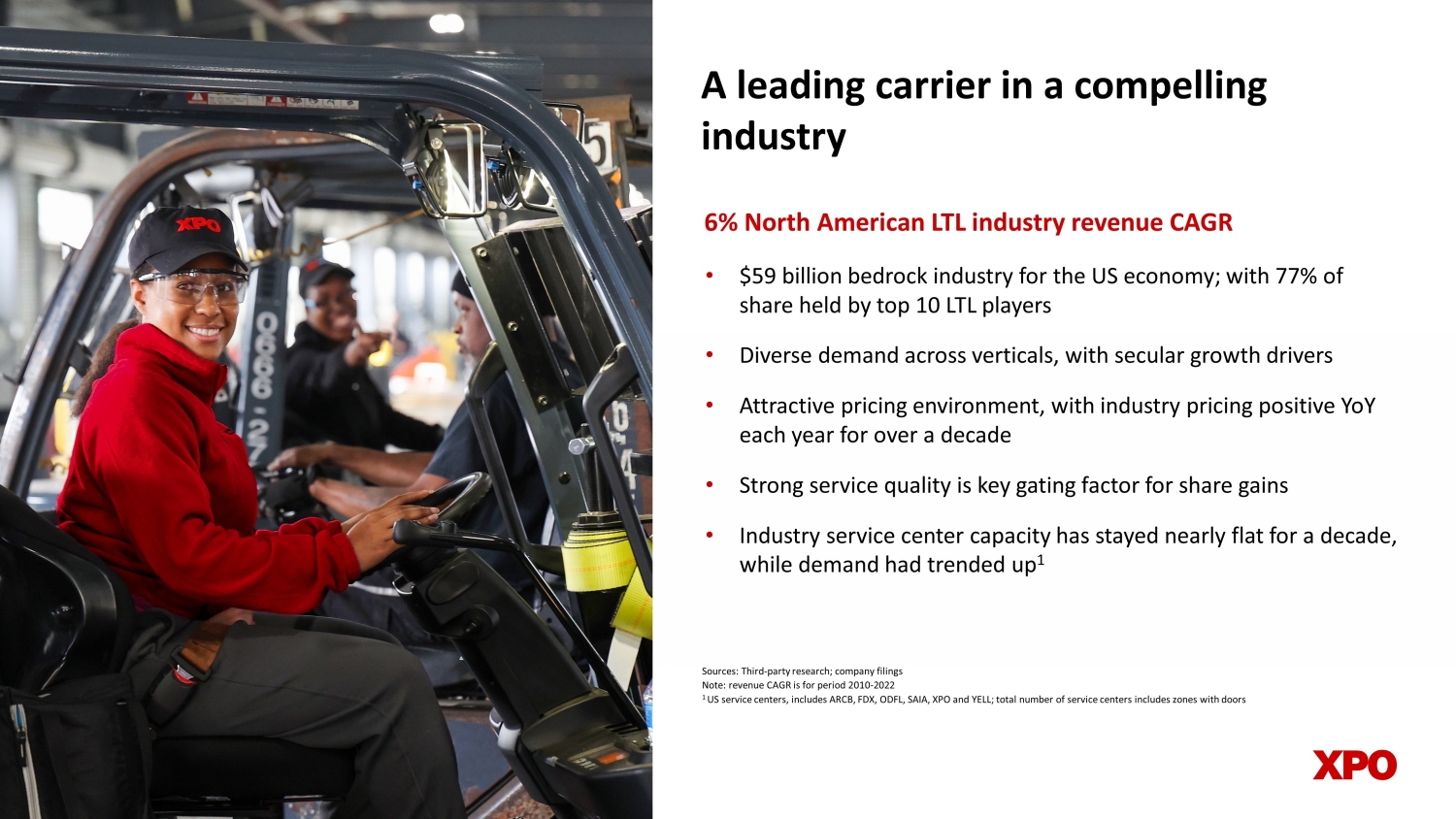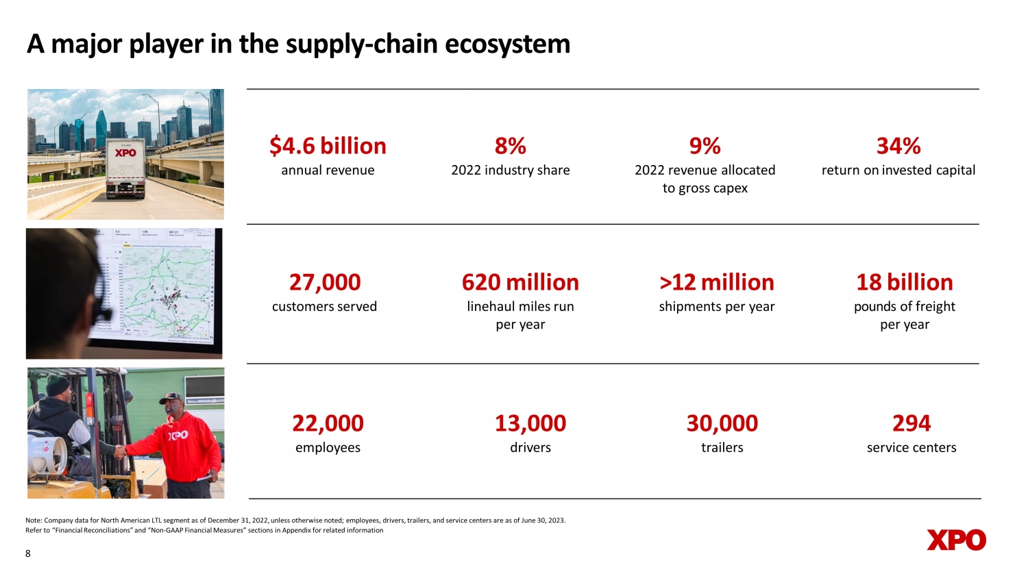 A major player in the supply - chain ecosystem Note: Company data for North American LTL segment as of December 31, 2022, unless otherwise noted; employees, drivers, traile rs, and service centers are as of June 30, 2023. Refer to “Financial Reconciliations” and “Non - GAAP Financial Measures” sections in Appendix for related information 9% 2022 revenue allocated to gross capex 34 % return on invested capital >12 million s hipments per year 2 7 ,000 customers served $4.6 billion annual revenue 8 % 2022 industry share 8 13,0 0 0 d rivers 30 ,0 0 0 t railers 18 billion pounds of freight per year 6 2 0 million l inehaul miles run per year 22,0 0 0 e mployees 294 service centers