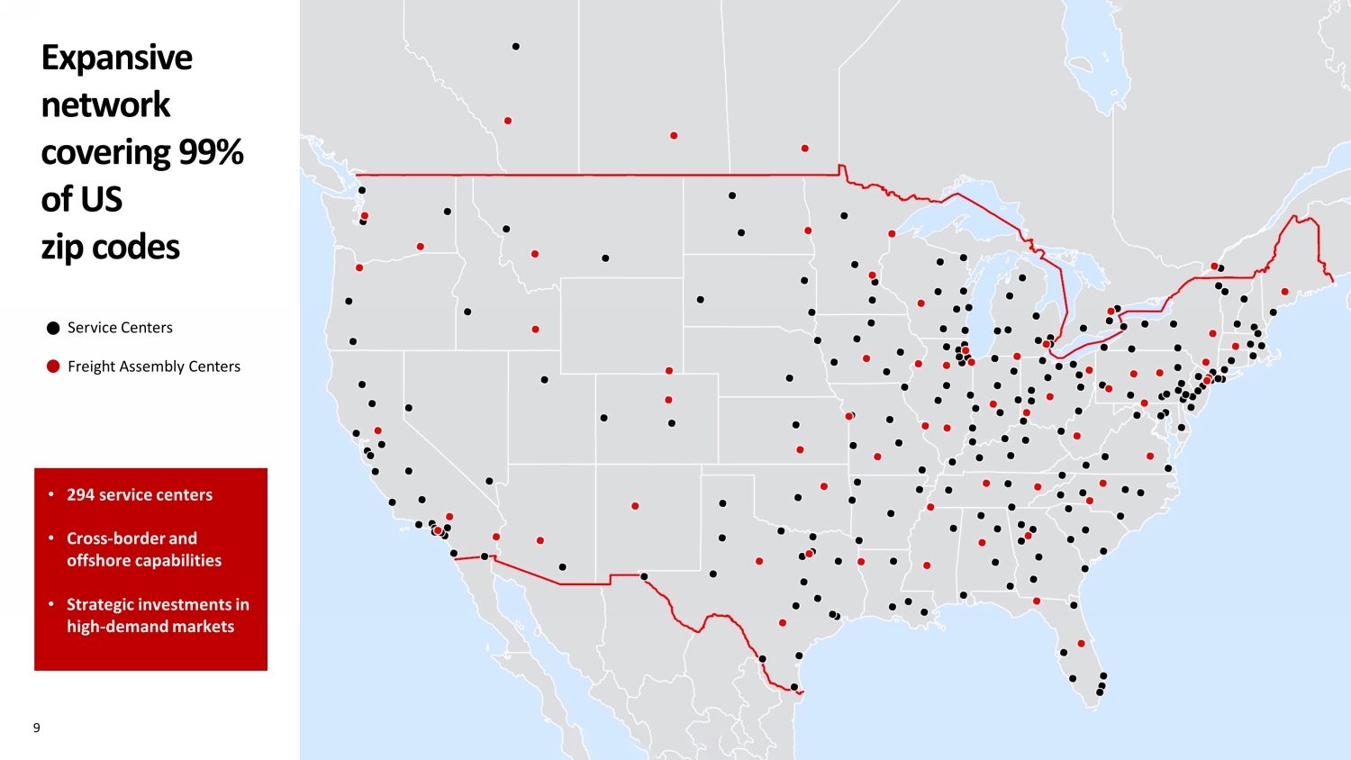 9 Expansive network covering 99% of US zip codes • 294 service centers • Cross - border and offshore capabilities • Strategic investments in high - demand markets Freight Assembly Centers Service Centers
