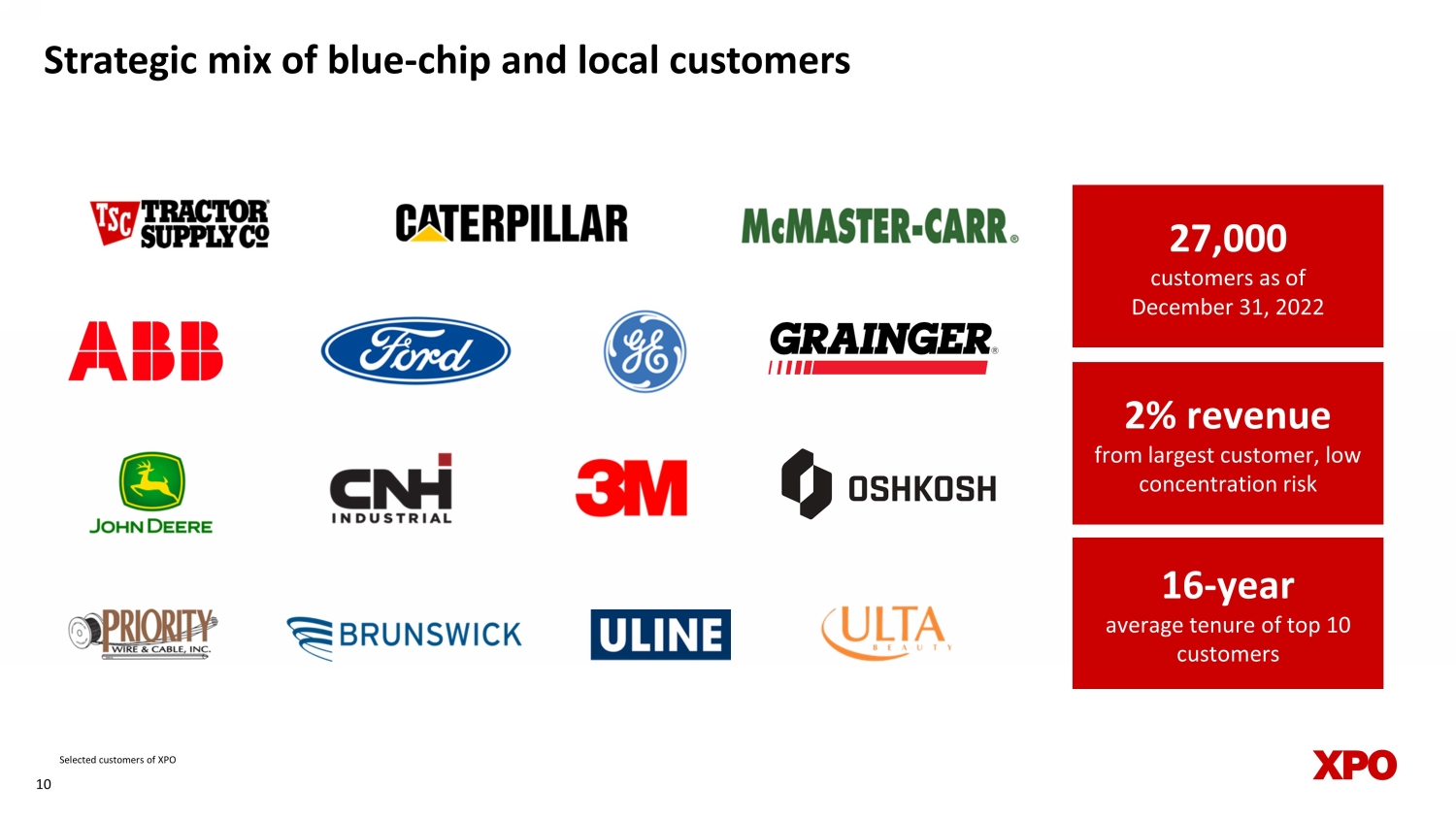 Strategic mix of blue - chip and local customers 10 2% revenue from largest customer, low concentration risk 16 - y ear average t enure of t op 10 customers 27,000 customers as of December 31, 2022 Selected customers of XPO