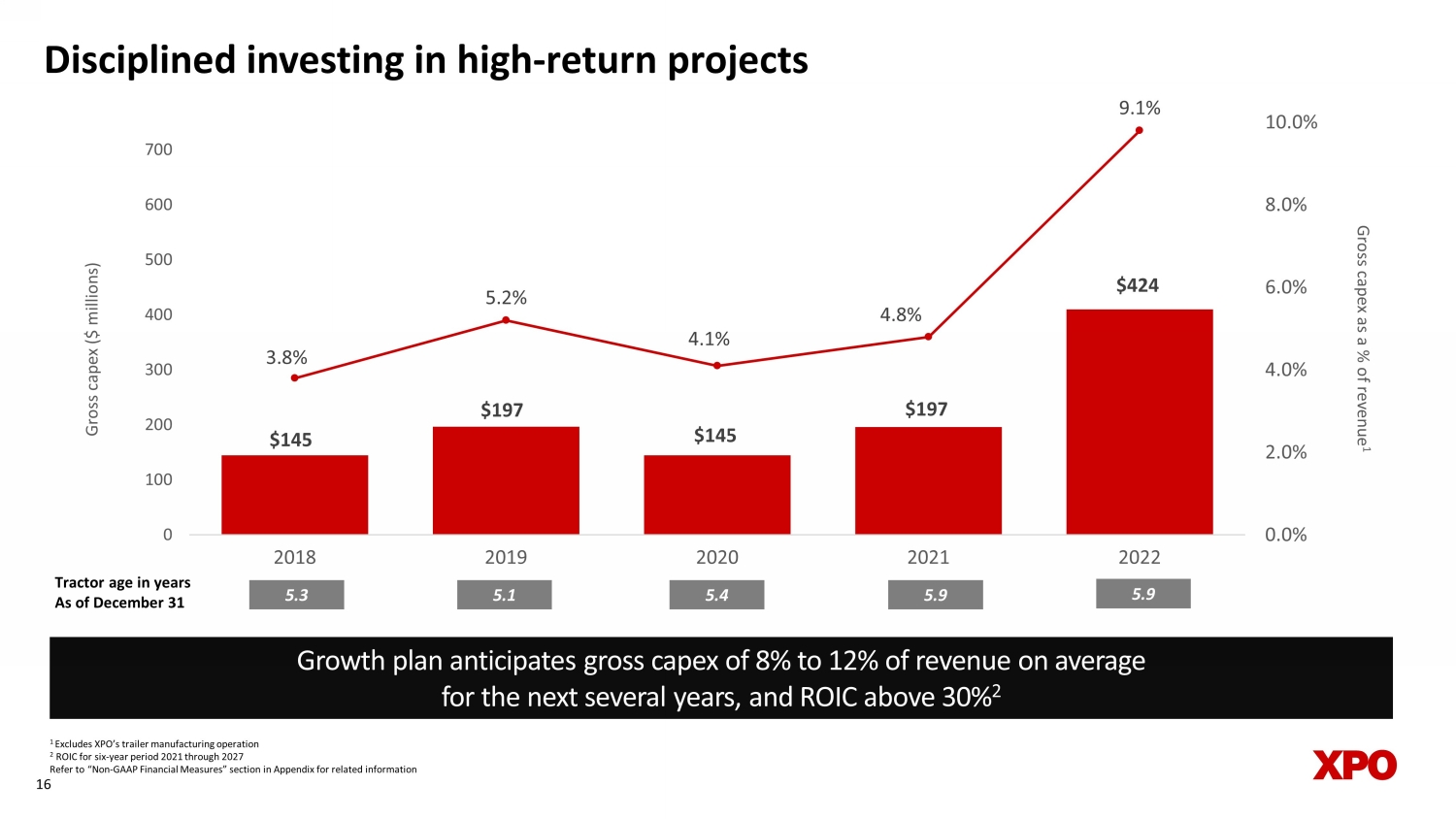 $145 $197 $145 $197 $424 3.8% 5.2% 4.1% 4.8% 9.1% 0.0% 2.0% 4.0% 6.0% 8.0% 10.0% 0 100 200 300 400 500 600 700 2018 2019 2020 2021 2022 Gross capex as a % of revenue 1 Gross capex ($ millions) Disciplined investing in high - return projects 16 Tractor age in years As of December 31 5.3 5.1 5.4 5.9 5.9 1 Excludes XPO’s trailer manufacturing operation 2 ROIC for six - year period 2021 through 2027 Refer to “Non - GAAP Financial Measures” section in Appendix for related information Growth plan anticipates gross capex of 8% to 12% of revenue on average for the next several years, and ROIC above 30% 2