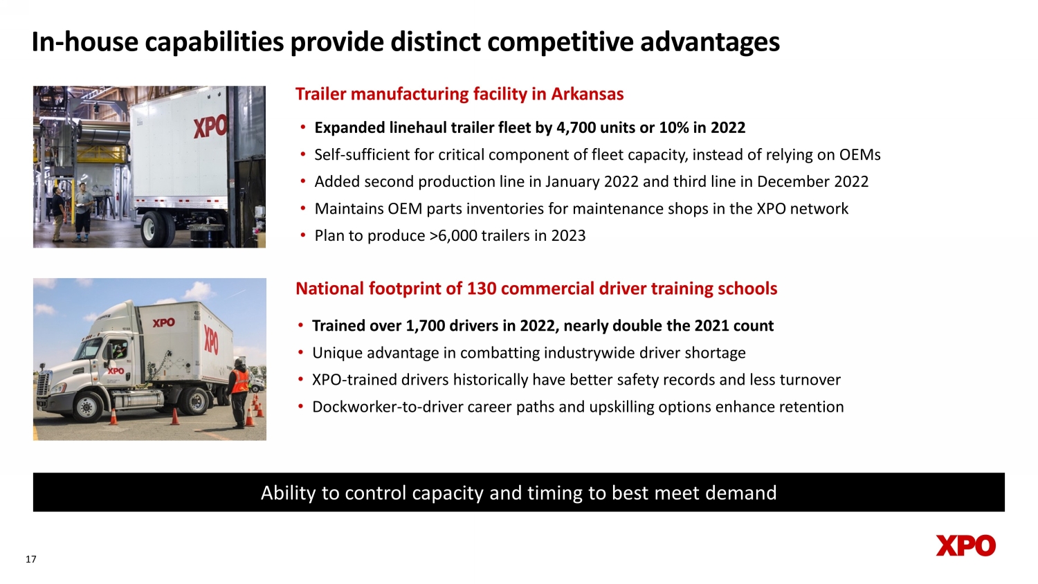 In - house capabilities provide distinct competitive advantages Trailer manufacturing facility in Arkansas • Expanded linehaul trailer fleet by 4,700 units or 10% in 2022 • Self - sufficient for critical component of fleet capacity, instead of relying on OEMs • Added second production line in January 2022 and third line in December 2022 • Maintains OEM parts inventories for maintenance shops in the XPO network • Plan to produce >6,000 trailers in 2023 17 Ability to control capacity and timing to best meet demand National footprint of 130 commercial driver training schools • Trained over 1,700 drivers in 2022, nearly double the 2021 count • Unique advantage in combatting industrywide driver shortage • XPO - trained drivers historically have better safety records and less turnover • Dockworker - to - driver career paths and upskilling options enhance retention