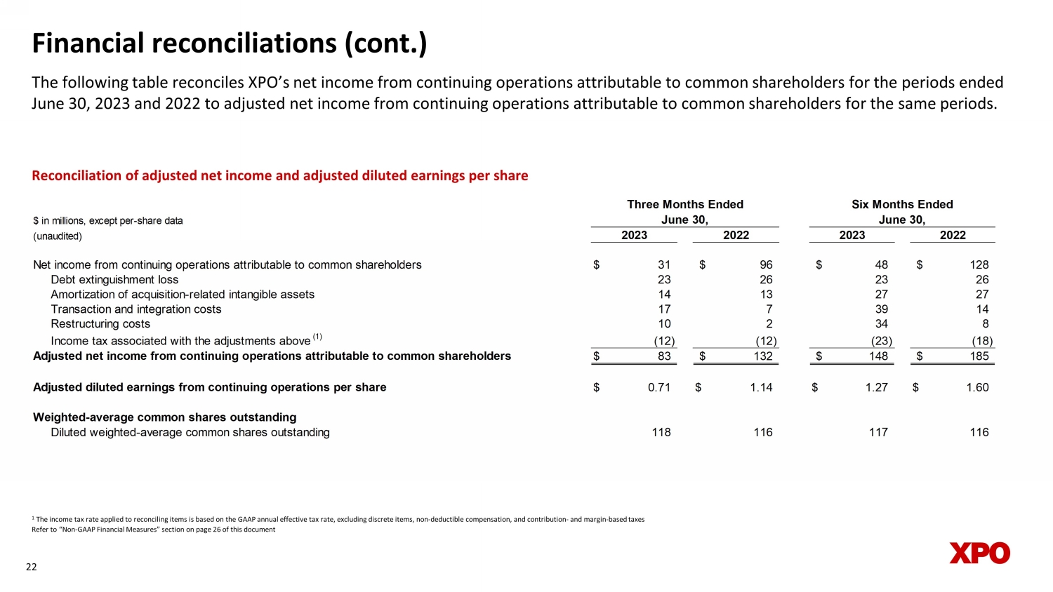 Financial reconciliations (cont.) The following table reconciles XPO’s net income from continuing operations attributable to common shareholders for the period s e nded June 30, 2023 and 2022 to adjusted net income from continuing operations attributable to common shareholders for the same per iod s. 22 1 The income tax rate applied to reconciling items is based on the GAAP annual effective tax rate, excluding discrete items, no n - deductible compensation, and contribution - and margin - based taxes Refer to “Non - GAAP Financial Measures” section on page 26 of this document Reconciliation of adjusted net income and adjusted diluted earnings per share $ in millions, except per-share data (unaudited) Net income from continuing operations attributable to common shareholders $ 31 $ 96 $ 48 $ 128 Debt extinguishment loss 23 26 23 26 Amortization of acquisition-related intangible assets 14 13 27 27 Transaction and integration costs 17 7 39 14 Restructuring costs 10 2 34 8 Income tax associated with the adjustments above (1) (12) (12) (23) (18) Adjusted net income from continuing operations attributable to common shareholders $ 83 $ 132 $ 148 $ 185 Adjusted diluted earnings from continuing operations per share $ 0.71 $ 1.14 $ 1.27 $ 1.60 Weighted-average common shares outstanding Diluted weighted-average common shares outstanding 118 116 117 116 Three Months Ended Six Months Ended June 30, June 30, 2023 2022 2023 2022