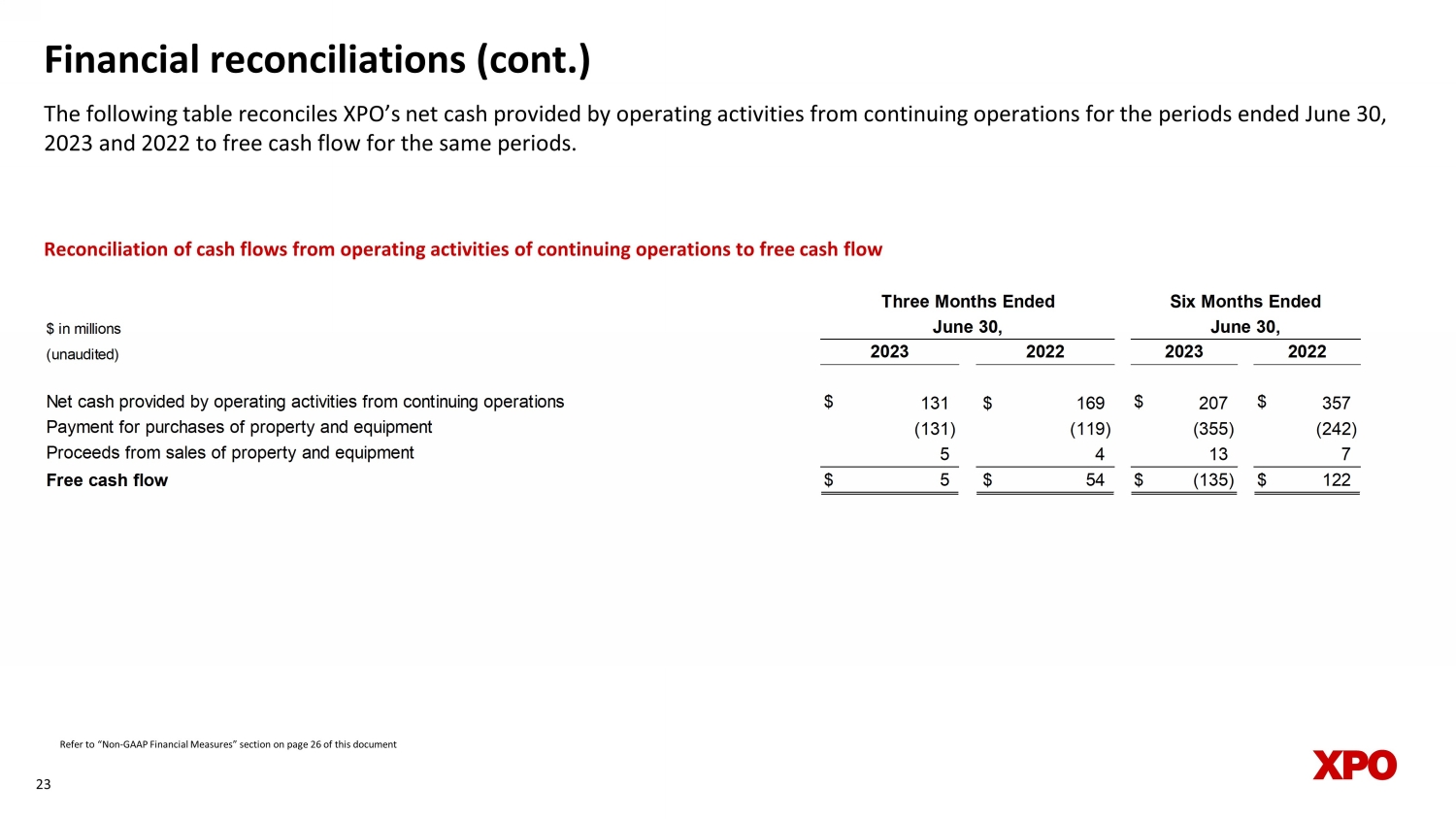 Financial reconciliations (cont.) The following table reconciles XPO’s net cash provided by operating activities from continuing operations for the periods end ed June 30, 2023 and 2022 to free cash flow for the same periods. 23 Reconciliation of cash flows from operating activities of continuing operations to free cash flow Refer to “Non - GAAP Financial Measures” section on page 26 of this document $ in millions (unaudited) Net cash provided by operating activities from continuing operations $ 131 $ 169 $ 207 $ 357 Payment for purchases of property and equipment (131) (119) (355) (242) Proceeds from sales of property and equipment 5 4 13 7 Free cash flow $ 5 $ 54 $ (135) $ 122 Three Months Ended Six Months Ended June 30, June 30, 2023 2022 2023 2022