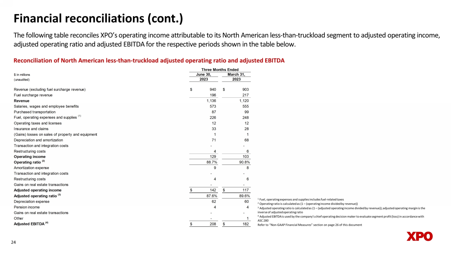 Financial reconciliations (cont.) The following table reconciles XPO’s operating income attributable to its North American less - than - truckload segment to adjusted operating income, adjusted operating ratio and adjusted EBITDA for the respective periods shown in the table below. 24 Reconciliation of North American less - than - truckload adjusted operating ratio and adjusted EBITDA 1 Fuel, operating expenses and supplies includes fuel - related taxes 2 Operating ratio is calculated as (1 – (operating income divided by revenue)) 3 Adjusted operating ratio is calculated as (1 – (adjusted operating income divided by revenue)); adjusted operating margin is th e inverse of adjusted operating ratio 4 Adjusted EBITDA is used by the company’s chief operating decision maker to evaluate segment profit (loss) in accordance with ASC 280 Refer to “Non - GAAP Financial Measures” section on page 26 of this document $ in millions (unaudited) Revenue (excluding fuel surcharge revenue) $ 940 $ 903 Fuel surcharge revenue 196 217 Revenue 1,136 1,120 Salaries, wages and employee benefits 573 555 Purchased transportation 87 99 Fuel, operating expenses and supplies (1) 226 248 Operating taxes and licenses 12 12 Insurance and claims 33 28 (Gains) losses on sales of property and equipment 1 1 Depreciation and amortization 71 68 Transaction and integration costs - - Restructuring costs 4 6 Operating income 129 103 Operating ratio (2) 88.7% 90.8% Amortization expense 9 8 Transaction and integration costs - - Restructuring costs 4 6 Gains on real estate transactions - - Adjusted operating income $ 142 $ 117 Adjusted operating ratio (3) 87.6% 89.6% Depreciation expense 62 60 Pension income 4 4 Gains on real estate transactions - - Other - 1 Adjusted EBITDA (4) $ 208 $ 182 2023 2023 March 31, Three Months Ended June 30,