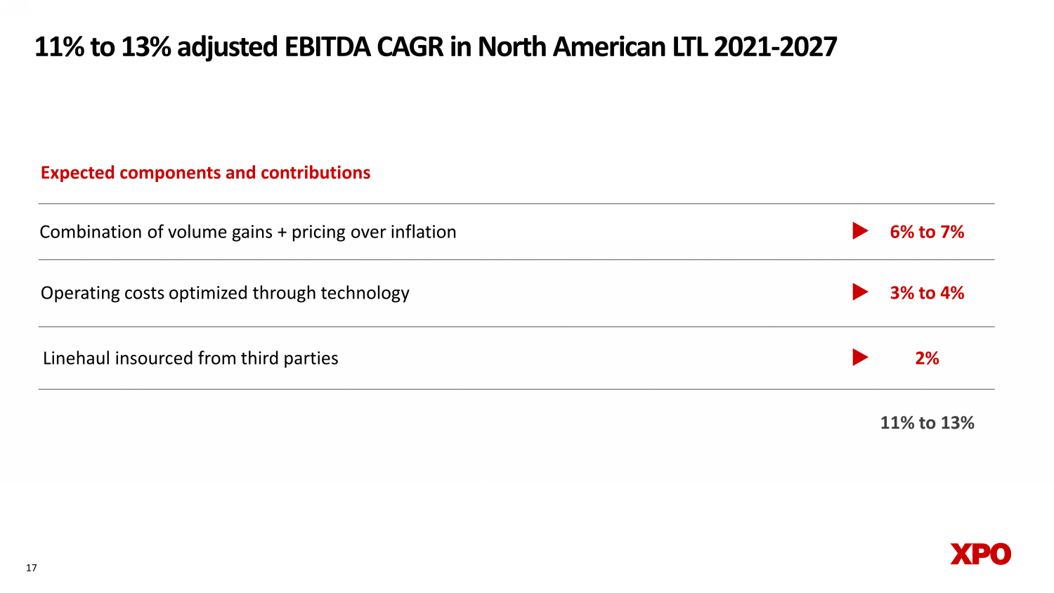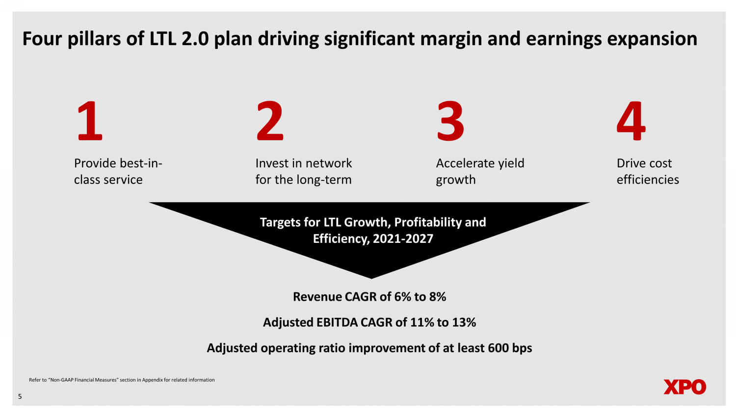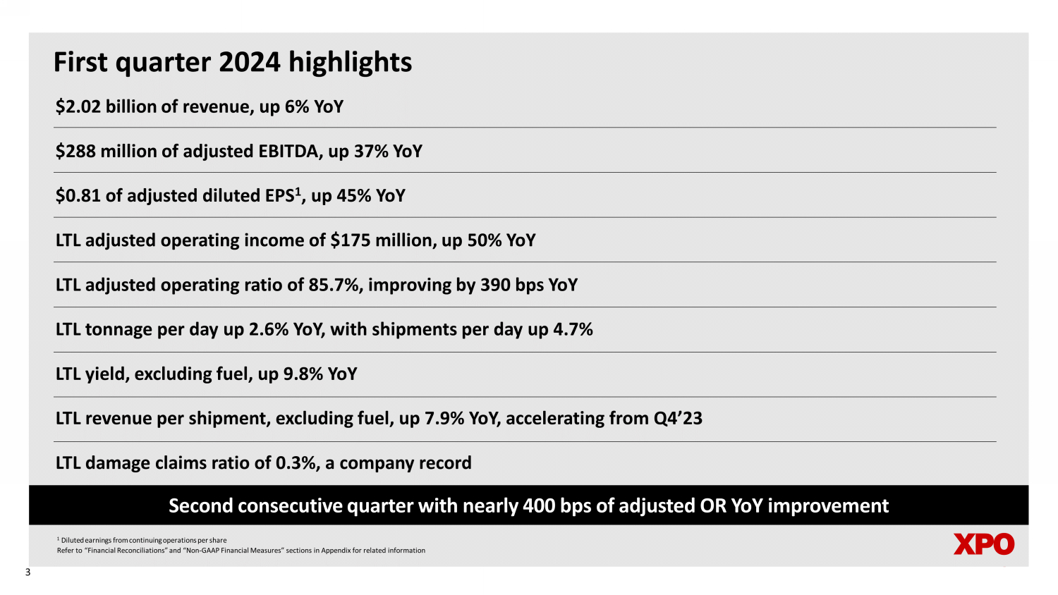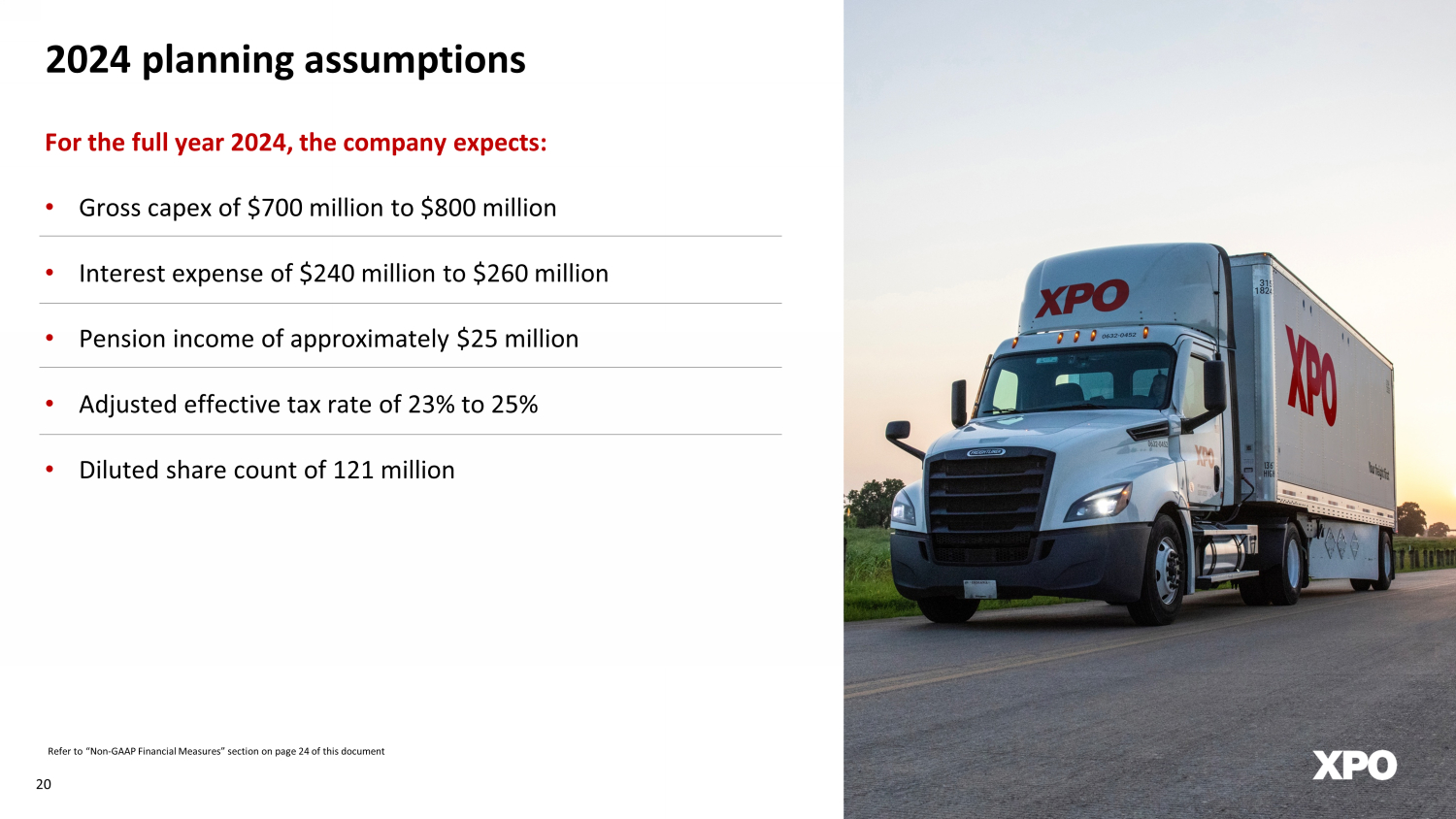 Non - GAAP financial measures As required by the rules of the Securities and Exchange Commission (“SEC”), we provide reconciliations of the non - GAAP financial measures contained in this document to the most directly comparable measure under GAAP, which are set forth in the financial tables attached to this document . This document contains the following non - GAAP financial measures : adjusted earnings before interest, taxes, depreciation and amortization (“adjusted EBITDA”) on a consolidated basis ; adjusted net income from continuing operations ; adjusted diluted earnings from continuing operations per share ("adjusted EPS") ; adjusted operating income for our North American Less - Than - Truckload segment ; adjusted operating ratio for our North American Less - Than - Truckload segment ; and adjusted effective tax rate . We believe that the above adjusted financial measures facilitate analysis of our ongoing business operations because they exclude items that may not be reflective of, or are unrelated to, XPO and its business segments’ core operating performance, and may assist investors with comparisons to prior periods and assessing trends in our underlying businesses . Other companies may calculate these non - GAAP financial measures differently, and therefore our measures may not be comparable to similarly titled measures of other companies . These non - GAAP financial measures should only be used as supplemental measures of our operating performance . Adjusted EBITDA, adjusted net income from continuing operations, adjusted EPS, adjusted operating income and adjusted operating ratio include adjustments for transaction and integration costs, as well as restructuring costs, and other adjustments as set forth in the attached tables . Transaction and integration adjustments are generally incremental costs that result from an actual or planned acquisition, divestiture or spin - off and may include transaction costs, consulting fees, stock - based compensation, retention awards, internal salaries and wages (to the extent the individuals are assigned full - time to integration and transformation activities) and certain costs related to integrating and converging IT systems . Restructuring costs primarily relate to severance costs associated with business optimization initiatives . Management uses these non - GAAP financial measures in making financial, operating and planning decisions and evaluating XPO’s and each business segment’s ongoing performance . We believe that adjusted EBITDA improves comparability from period to period by removing the impact of our capital structure (interest and financing expenses), asset base (depreciation and amortization), tax impacts and other adjustments as set out in the attached tables that management has determined are not reflective of core operating activities and thereby assist investors with assessing trends in our underlying businesses . We believe that adjusted net income from continuing operations and adjusted EPS improve the comparability of our operating results from period to period by removing the impact of certain costs and gains that management has determined are not reflective of our core operating activities, including amortization of acquisition - related intangible assets, transaction and integration costs, restructuring costs and other adjustments as set out in the attached tables . We believe that adjusted operating income and adjusted operating ratio improve the comparability of our operating results from period to period by removing the impact of certain transaction and integration costs and restructuring costs, as well as amortization expenses . We believe that adjusted effective tax rate improves comparability of our effective tax rate, by excluding the tax effect of special items . With respect to our financial targets for ( i ) the six - year period 2021 through 2027 of North American less - than - truckload adjusted EBITDA CAGR, and adjusted operating ratio and (ii) the 2024 adjusted effective tax rate, a reconciliation of these non - GAAP measures to the corresponding GAAP measures is not available without unreasonable effort due to the variability and complexity of the reconciling items described above that we exclude from these non - GAAP target measures . The variability of these items may have a significant impact on our future GAAP financial results and, as a result, we are unable to prepare the forward - looking statement of income and statement of cash flows in accordance with GAAP that would be required to produce such a reconciliation . 24