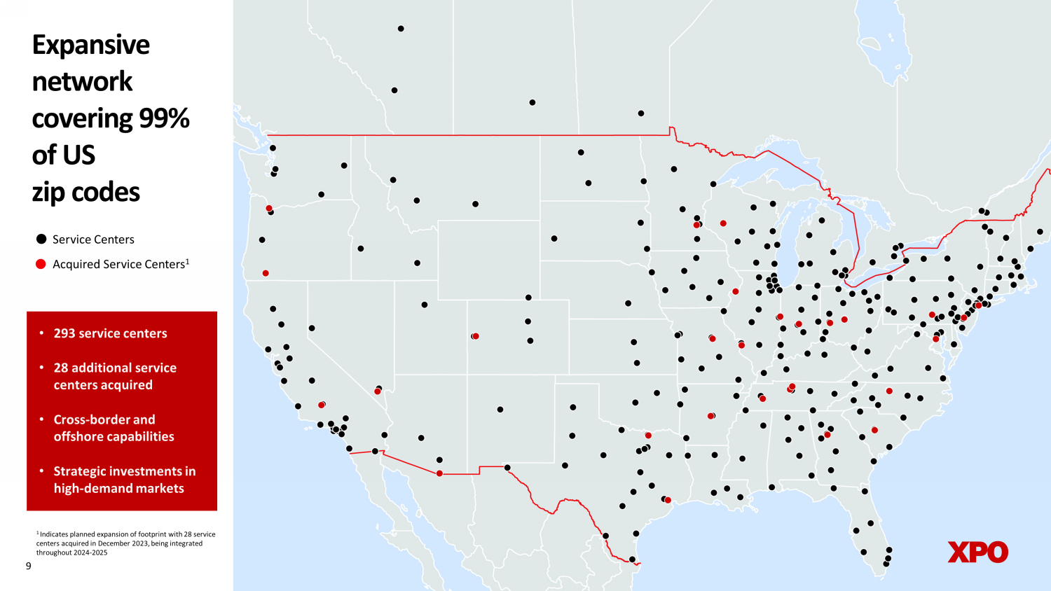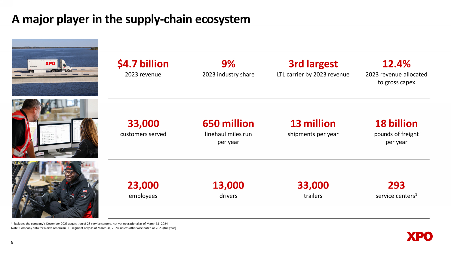 A major player in the supply - chain ecosystem 1 Excludes the company’s December 2023 acquisition of 28 service centers, not yet operational as of March 31, 2024 Note: Company data for North American LTL segment only as of March 31, 2024, unless otherwise noted as 2023 (full year) 3 rd largest LTL carrier by 2023 revenue 12.4% 2023 revenue allocated to gross capex 13 million s hipments per year 33 ,000 customers served $4.7 billion 2023 revenue 9 % 2023 industry share 8 13,0 0 0 d rivers 33 ,0 0 0 t railers 18 billion pounds of freight per year 6 5 0 million l inehaul miles run per year 2 3 ,0 0 0 e mployees 293 service centers 1 quarterly (bring back
