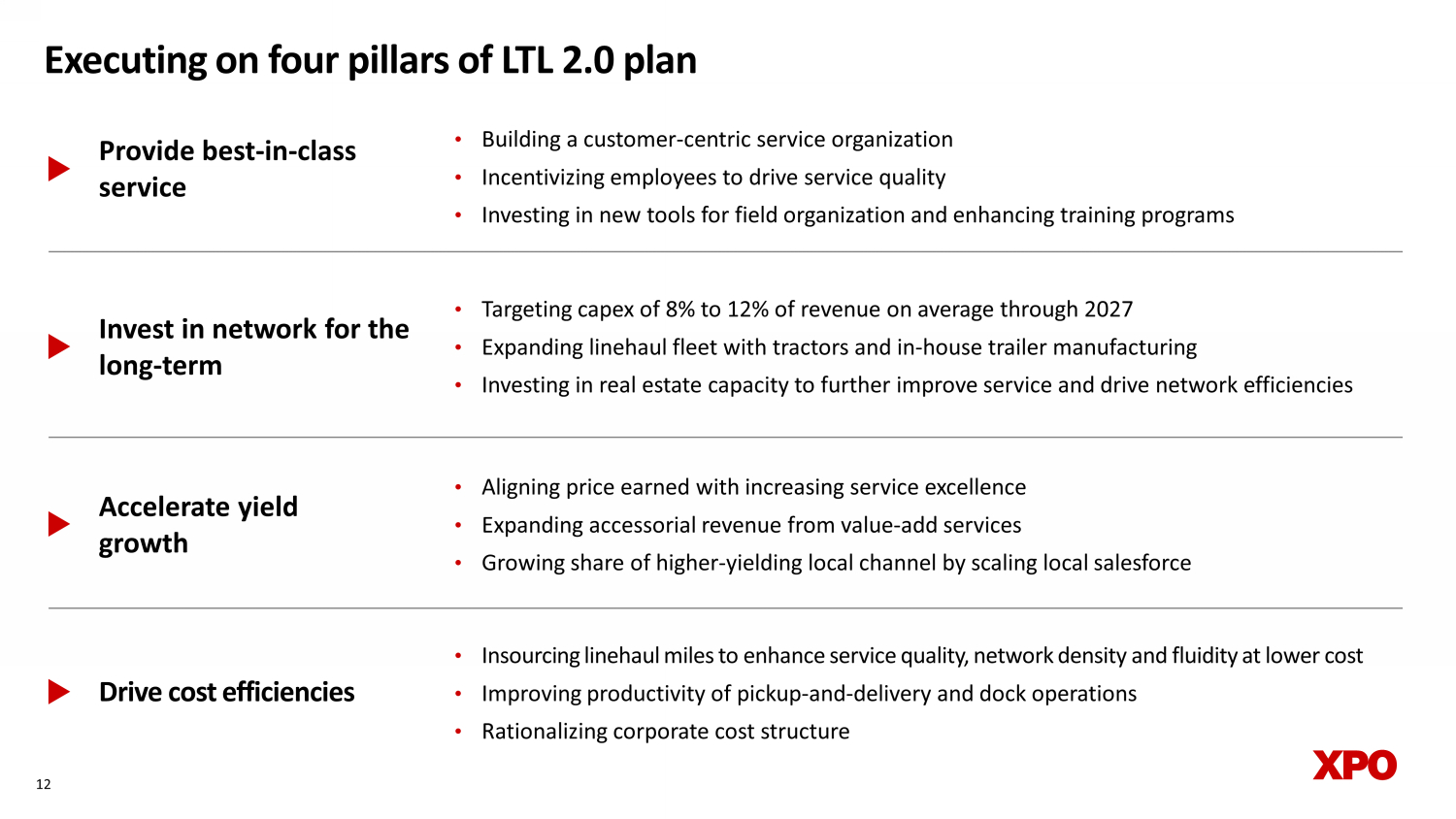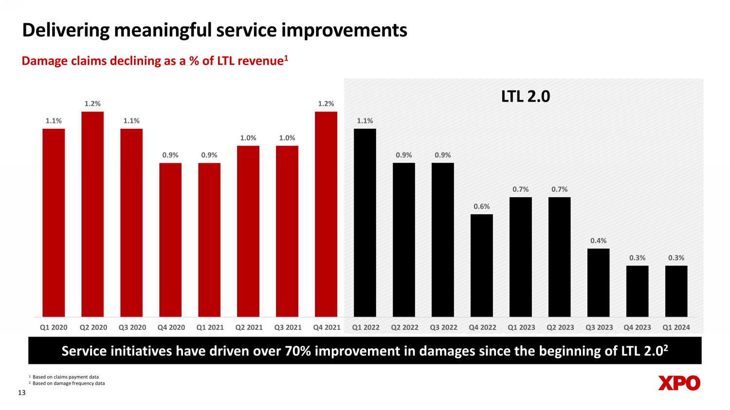 Provide best - in - class service Accelerate yield growth Drive cost efficiencies • Aligning price earned with increasing service excellence • Expanding accessorial revenue from value - add services • Growing share of higher - yielding local channel by scaling local salesforce • Insourcing linehaul miles to enhance service quality, network density and fluidity at lower cost • Improving productivity of pickup - and - delivery and dock operations • Rationalizing corporate cost structure 12 Executing on four pillars of LTL 2.0 plan • Building a customer - centric service organization • Incentivizing employees to drive service quality • Investing in new tools for field organization and enhancing training programs Invest in network for the long - term • Targeting capex of 8% to 12% of revenue on average through 2027 • Expanding linehaul fleet with tractors and in - house trailer manufacturing • Investing in real estate capacity to further improve service and drive network efficiencies
