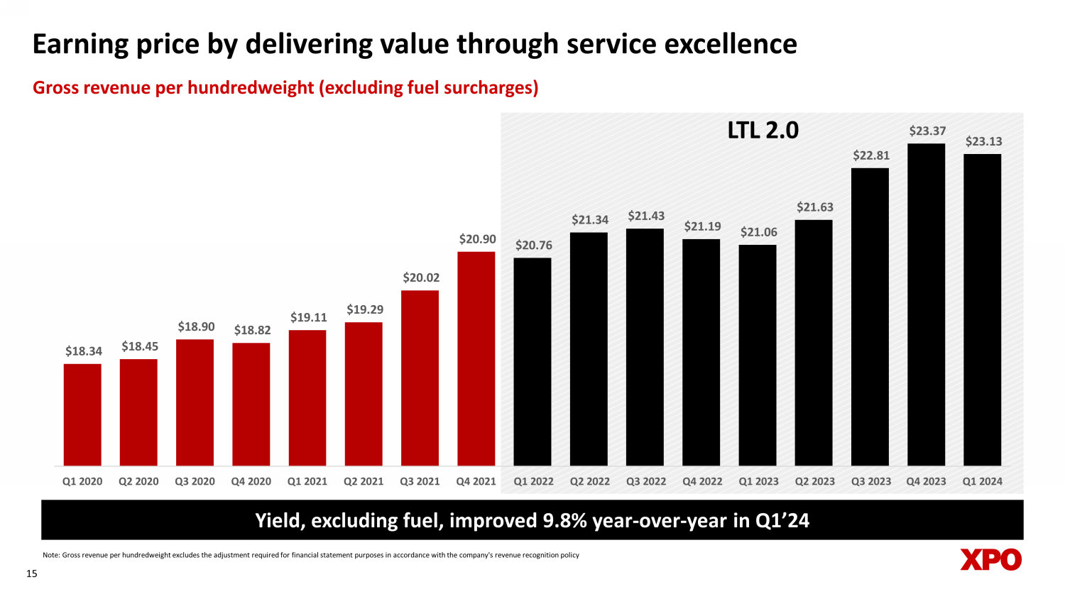 $ in millions (unaudited) Change % Revenue (excluding fuel surcharge revenue) $ 1,011 $ 903 12.0% Fuel surcharge revenue 210 217 -3.2% Revenue 1,221 1,120 9.0% Salaries, wages and employee benefits 613 555 10.5% Purchased transportation 78 99 -21.2% Fuel, operating expenses and supplies (1) 243 248 -2.0% Operating taxes and licenses 16 12 33.3% Insurance and claims 21 28 -25.0% Losses on sales of property and equipment 2 1 100.0% Depreciation and amortization 82 68 20.6% Restructuring costs - 6 -100.0% Operating income 165 103 60.2% Operating ratio (2) 86.4% 90.8% Amortization expense 9 8 Restructuring costs - 6 Adjusted operating income $ 175 $ 117 49.6% Adjusted operating ratio (3) 85.7% 89.6% Depreciation expense 73 60 Pension income 6 4 Other - 1 Adjusted EBITDA (4) $ 255 $ 182 40.1% 2024 2023 Three Months Ended March 31, Financial reconciliations (cont.) The following table reconciles XPO’s operating income attributable to its North American less - than - truckload (LTL) segment for t he periods ended March 31, 2024 and 2023 to adjusted operating income, adjusted operating ratio and adjusted EBITDA. 23 Reconciliation of N orth American LTL adjusted operating income, adjusted operating ratio and adjusted EBITDA Amounts may not add due to rounding 1 Fuel, operating expenses and supplies includes fuel - related taxes 2 Operating ratio is calculated as (1 – (operating income divided by revenue)) 3 Adjusted operating ratio is calculated as (1 – (adjusted operating income divided by revenue)) 4 Adjusted EBITDA is used by the company's chief operating decision maker to evaluate segment profit (loss) in accordance with ASC 280 Refer to “Non - GAAP Financial Measures” section on page 24 of this document
