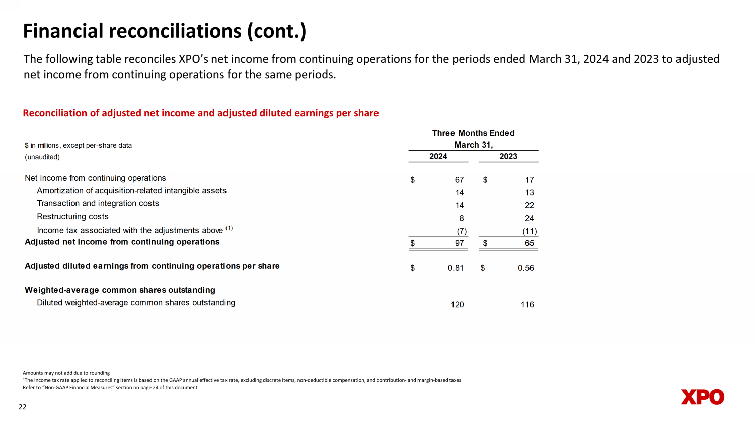 Financial reconciliations (cont.) The following table reconciles XPO’s net income from continuing operations for the periods ended March 31, 2024 and 2023 to a dju sted net income from continuing operations for the same periods. 22 Amounts may not add due to rounding 1 The income tax rate applied to reconciling items is based on the GAAP annual effective tax rate, excluding discrete items, no n - d eductible compensation, and contribution - and margin - based taxes Refer to “Non - GAAP Financial Measures” section on page 24 of this document Reconciliation of adjusted net income and adjusted diluted earnings per share $ in millions, except per-share data (unaudited) Net income from continuing operations $ 67 $ 17 Amortization of acquisition-related intangible assets 14 13 Transaction and integration costs 14 22 Restructuring costs 8 24 Income tax associated with the adjustments above (1) (7) (11) Adjusted net income from continuing operations $ 97 $ 65 Adjusted diluted earnings from continuing operations per share $ 0.81 $ 0.56 Weighted-average common shares outstanding Diluted weighted-average common shares outstanding 120 116 2024 2023 Three Months Ended March 31,
