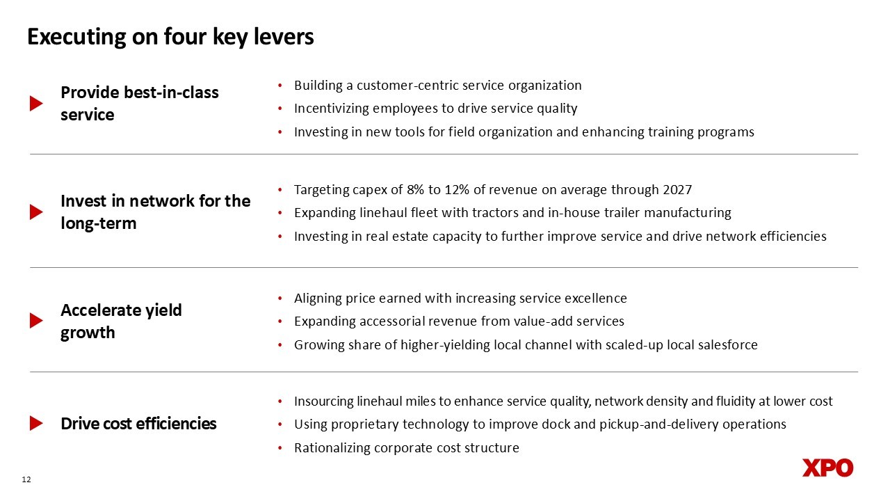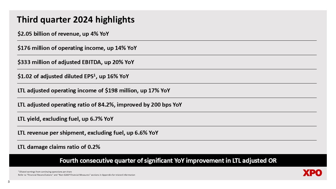 2 Forward - looking statements This document includes forward - looking statements within the meaning of Section 27 A of the Securities Act of 1933 , as amended, and Section 21 E of the Securities Exchange Act of 1934 , as amended, including statements relating to our full year 2024 expectations of gross capex, interest expense, pension income, adjusted effective tax rate, and diluted share count, and future financial targets of North American LTL revenue CAGR, adjusted EBITDA CAGR, adjusted operating ratio improvement, and capex as a percentage of revenue . All statements other than statements of historical fact are, or may be deemed to be, forward - looking statements . In some cases, forward - looking statements can be identified by the use of forward - looking terms such as “anticipate,” “estimate,” “believe,” “continue,” “could,” “intend,” “may,” “plan,” “potential,” “predict,” “should,” “will,” “expect,” “objective,” “projection,” “forecast,” “goal,” “guidance,” “outlook,” “effort,” “target,” “trajectory” or the negative of these terms or other comparable terms . These forward - looking statements are based on certain assumptions and analyses made by us in light of our experience and our perception of historical trends, current conditions and expected future developments, as well as other factors we believe are appropriate in the circumstances . These forward - looking statements are subject to known and unknown risks, uncertainties and assumptions that may cause actual results, levels of activity, performance or achievements to be materially different from any future results, levels of activity, performance or achievements expressed or implied by such forward - looking statements . Factors that might cause or contribute to a material difference include the risks discussed in our filings with the SEC, and the following : the effects of business, economic, political, legal, and regulatory impacts or conflicts upon our operations ; supply chain disruptions and shortages, strains on production or extraction of raw materials, cost inflation and labor and equipment shortages ; our ability to align our investments in capital assets, including equipment, service centers, and warehouses to our customers’ demands ; our ability to implement our cost and revenue initiatives ; the effectiveness of our action plan, and other management actions, to improve our North American LTL business ; our ability to continue insourcing linehaul in ways that enhance our network efficiency and service ; the anticipated impact of a freight market recovery on our business ; our ability to benefit from a sale, spin - off or other divestiture of one or more business units or to successfully integrate and realize anticipated synergies, cost savings and profit opportunities from acquired companies ; goodwill impairment ; issues related to compliance with data protection laws, competition laws, and intellectual property laws ; fluctuations in currency exchange rates, fuel prices and fuel surcharges ; the expected benefits of the spin - offs of GXO Logistics, Inc . and RXO, Inc .; our ability to develop and implement suitable information technology systems ; the impact of potential cyber - attacks and information technology or data security breaches or failures ; our indebtedness ; our ability to raise debt and equity capital ; fluctuations in interest rates ; seasonal fluctuations ; our ability to maintain positive relationships with our network of third - party transportation providers ; our ability to attract and retain key employees including qualified drivers ; labor matters ; litigation ; and competition and pricing pressures . All forward - looking statements set forth in this document are qualified by these cautionary statements and there can be no assurance that the actual results or developments anticipated by us will be realized or, even if substantially realized, that they will have the expected consequences to or effects on us or our business or operations . Forward - looking statements set forth in this document speak only as of the date hereof, and we do not undertake any obligation to update forward - looking statements except to the extent required by law . Non - GAAP financial measures This presentation contains non - GAAP financial measures . For a description of these non - GAAP financial measures, including a reconciliation to the most comparable measure under GAAP, see the Appendix to this presentation .