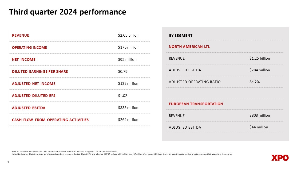 Third quarter 2024 highlights $2.05 billion of revenue, up 4% YoY $176 million of operating income, up 14% YoY $333 million of adjusted EBITDA, up 20% YoY $1.02 of adjusted diluted EPS 1 , up 16% YoY LTL adjusted operating income of $198 million, up 17% YoY LTL adjusted operating ratio of 84.2%, improved by 200 bps YoY LTL yield, excluding fuel, up 6.7% YoY LTL revenue per shipment, excluding fuel, up 6.6% YoY LTL damage claims ratio of 0.2% Fourth consecutive quarter of significant YoY improvement in LTL adjusted OR 1 Diluted earnings from continuing operations per share Refer to “Financial Reconciliations” and “Non - GAAP Financial Measures” sections in Appendix for related information 3