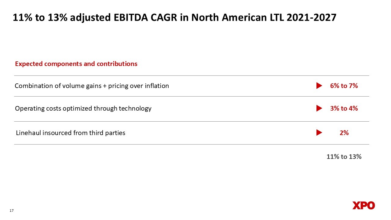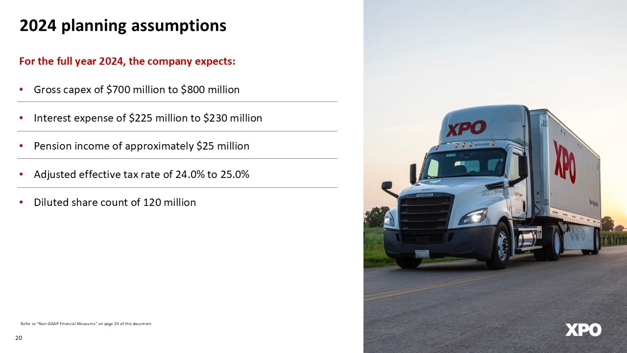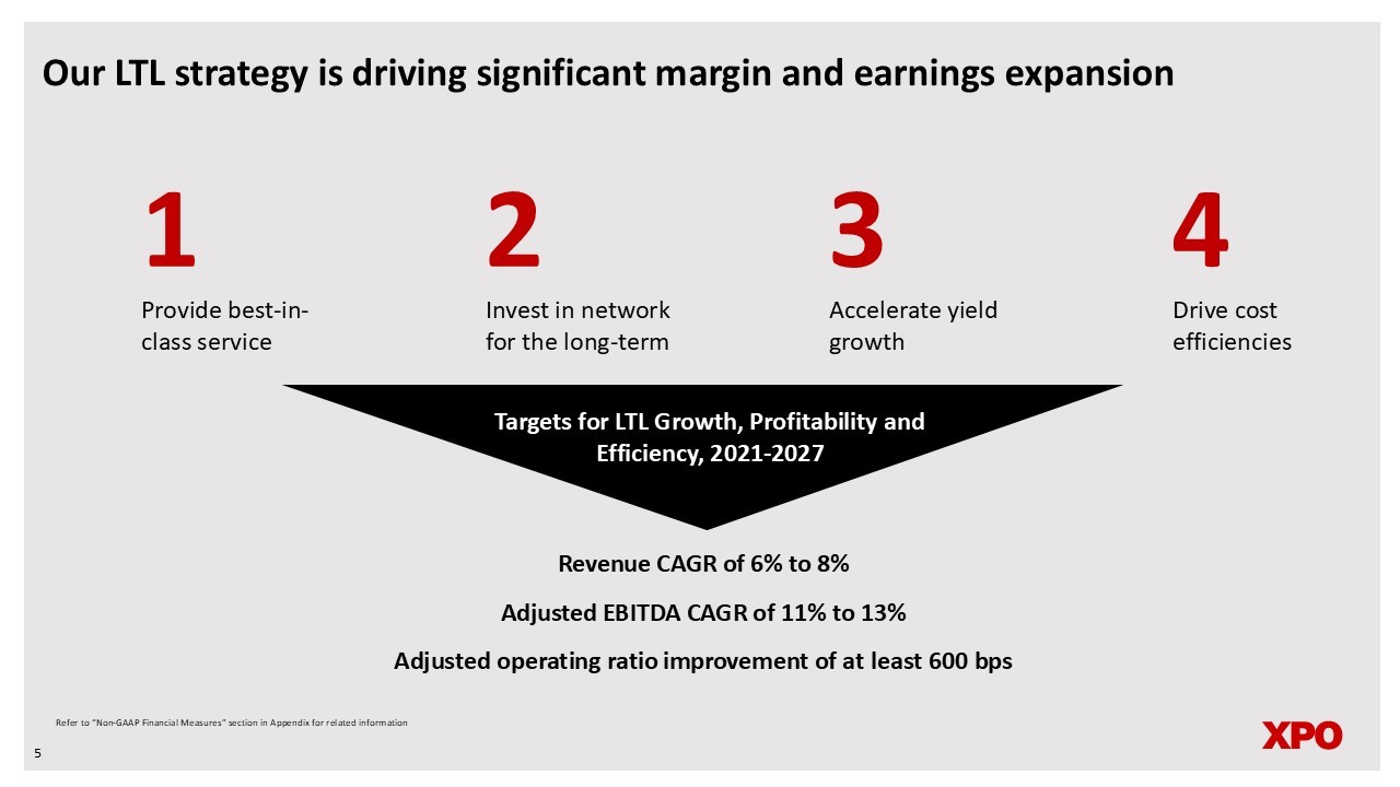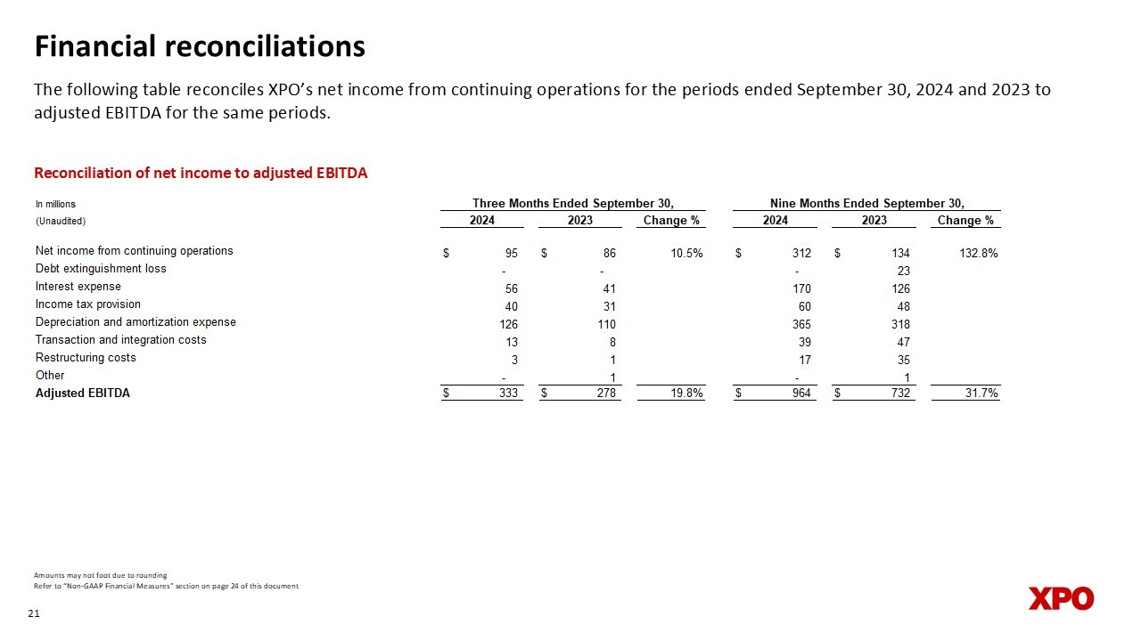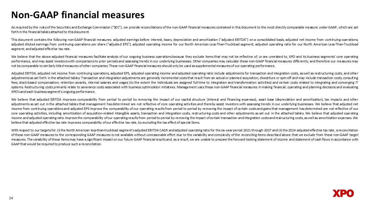 Non - GAAP financial measures As required by the rules of the Securities and Exchange Commission (“SEC”), we provide reconciliations of the non - GAAP financial measures contained in this document to the most directly comparable measure under GAAP, which are set forth in the financial tables attached to this document . This document contains the following non - GAAP financial measures : adjusted earnings before interest, taxes, depreciation and amortization (“adjusted EBITDA”) on a consolidated basis ; adjusted net income from continuing operations ; adjusted diluted earnings from continuing operations per share ("adjusted EPS") ; adjusted operating income for our North American Less - Than - Truckload segment ; adjusted operating ratio for our North American Less - Than - Truckload segment ; and adjusted effective tax rate . We believe that the above adjusted financial measures facilitate analysis of our ongoing business operations because they exclude items that may not be reflective of, or are unrelated to, XPO and its business segments’ core operating performance, and may assist investors with comparisons to prior periods and assessing trends in our underlying businesses . Other companies may calculate these non - GAAP financial measures differently, and therefore our measures may not be comparable to similarly titled measures of other companies . These non - GAAP financial measures should only be used as supplemental measures of our operating performance . Adjusted EBITDA, adjusted net income from continuing operations, adjusted EPS, adjusted operating income and adjusted operating ratio include adjustments for transaction and integration costs, as well as restructuring costs, and other adjustments as set forth in the attached tables . Transaction and integration adjustments are generally incremental costs that result from an actual or planned acquisition, divestiture or spin - off and may include transaction costs, consulting fees, stock - based compensation, retention awards, internal salaries and wages (to the extent the individuals are assigned full - time to integration and transformation activities) and certain costs related to integrating and converging IT systems . Restructuring costs primarily relate to severance costs associated with business optimization initiatives . Management uses these non - GAAP financial measures in making financial, operating and planning decisions and evaluating XPO’s and each business segment’s ongoing performance . We believe that adjusted EBITDA improves comparability from period to period by removing the impact of our capital structure (interest and financing expenses), asset base (depreciation and amortization), tax impacts and other adjustments as set out in the attached tables that management has determined are not reflective of core operating activities and thereby assist investors with assessing trends in our underlying businesses . We believe that adjusted net income from continuing operations and adjusted EPS improve the comparability of our operating results from period to period by removing the impact of certain costs and gains that management has determined are not reflective of our core operating activities, including amortization of acquisition - related intangible assets, transaction and integration costs, restructuring costs and other adjustments as set out in the attached tables . We believe that adjusted operating income and adjusted operating ratio improve the comparability of our operating results from period to period by removing the impact of certain transaction and integration costs and restructuring costs, as well as amortization expenses . We believe that adjusted effective tax rate improves comparability of our effective tax rate, by excluding the tax effect of special items . With respect to our targets for : ( i ) the North American less - than - truckload segment’s adjusted EBITDA CAGR and adjusted operating ratio for the six - year period 2021 through 2027 and (ii) the 2024 adjusted effective tax rate, a reconciliation of these non - GAAP measures to the corresponding GAAP measures is not available without unreasonable effort due to the variability and complexity of the reconciling items described above that we exclude from these non - GAAP target measures . The variability of these items may have a significant impact on our future GAAP financial results and, as a result, we are unable to prepare the forward - looking statement of income and statement of cash flows in accordance with GAAP that would be required to produce such a reconciliation . 24