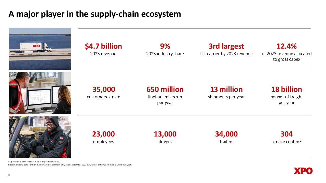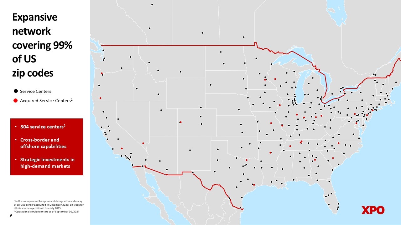 A major player in the supply - chain ecosystem 1 Operational service centers as of September 30, 2024 Note: Company data for North American LTL segment only as of September 30, 2024, unless otherwise noted as 2023 (full year) 3 rd largest LTL carrier by 2023 revenue 12.4% of 2023 revenue allocated to gross capex 13 million s hipments per year 35,000 customers served $4.7 billion 2023 revenue 9 % 2023 industry share 8 13,0 0 0 d rivers 34,0 0 0 t railers 18 billion pounds of freight per year 6 5 0 million l inehaul miles run per year 2 3 ,0 0 0 e mployees 304 service centers 1 quarterly (bring back
