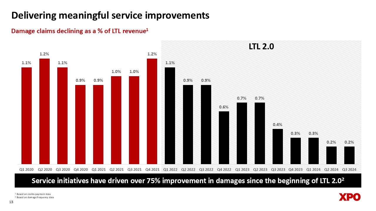 In millions (Unaudited) Change % Change % Revenue (excluding fuel surcharge revenue) $ 1,055 $ 1,005 5.0% $ 3,130 $ 2,848 9.9% Fuel surcharge revenue 195 223 -12.6% 613 636 -3.6% Revenue 1,251 1,228 1.9% 3,743 3,484 7.4% Salaries, wages and employee benefits 642 616 4.2% 1,894 1,744 8.6% Purchased transportation 58 97 -40.2% 204 283 -27.9% Fuel, operating expenses and supplies (1) 231 244 -5.3% 710 718 -1.1% Operating taxes and licenses 17 11 54.5% 49 35 40.0% Insurance and claims 21 20 5.0% 63 81 -22.2% Losses on sales of property and equipment 3 4 -25.0% 7 6 16.7% Depreciation and amortization 89 75 18.7% 257 214 20.1% Transaction and integration costs - - 0.0% 1 - NM Restructuring costs - - 0.0% 2 10 -80.0% Operating income 188 161 16.8% 556 393 41.5% Operating ratio (2) 85.0% 86.8% 85.1% 88.7% Amortization expense 9 9 27 26 Transaction and integration costs - - 1 - Restructuring costs - - 2 10 Adjusted operating income $ 198 $ 170 16.5% $ 587 $ 429 36.8% Adjusted operating ratio (3) 84.2% 86.2% 84.3% 87.7% Depreciation expense 80 66 229 188 Pension income 6 5 19 13 Other - - - 1 Adjusted EBITDA (4) $ 284 $ 241 17.8% $ 836 $ 631 32.5% 2024 2023 Three Months Ended September 30, Nine Months Ended September 30, 2024 2023 Financial reconciliations (cont.) The following table reconciles XPO’s operating income attributable to its North American less - than - truckload ("LTL") segment for the periods ended September 30, 2024 and 2023 to adjusted operating income, adjusted operating ratio and adjusted EBITDA. 23 Reconciliation of N orth American LTL adjusted operating income, adjusted operating ratio and adjusted EBITDA Amounts may not add due to rounding NM - Not meaningful 1 Fuel, operating expenses and supplies includes fuel - related taxes 2 Operating ratio is calculated as (1 – (operating income divided by revenue)) 3 Adjusted operating ratio is calculated as (1 – (adjusted operating income divided by revenue)) 4 Adjusted EBITDA is used by the company's chief operating decision maker to evaluate segment profit (loss) in accordance with ASC 280 Refer to “Non - GAAP Financial Measures” on page 24 of this document