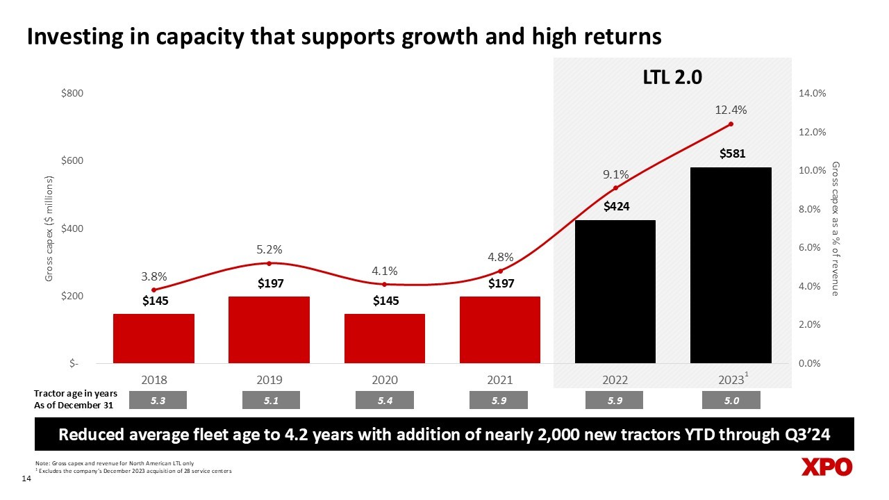1 Based on claims payment data 2 Based on damage frequency data 13 Service initiatives have driven over 75% improvement in damages since the beginning of LTL 2.0 2 LTL 2.0 Delivering meaningful service improvements Damage claims declining as a % of LTL revenue 1 1.1% 1.2% 1.1% 0.9% 0.9% 1.0% 1.0% 1.2% 1.1% 0.9% 0.9% 0.6% 0.7% 0.7% 0.4% 0.3% 0.3% 0.2% 0.2% Q1 2020 Q2 2020 Q3 2020 Q4 2020 Q1 2021 Q2 2021 Q3 2021 Q4 2021 Q1 2022 Q2 2022 Q3 2022 Q4 2022 Q1 2023 Q2 2023 Q3 2023 Q4 2023 Q1 2024 Q2 2024 Q3 2024