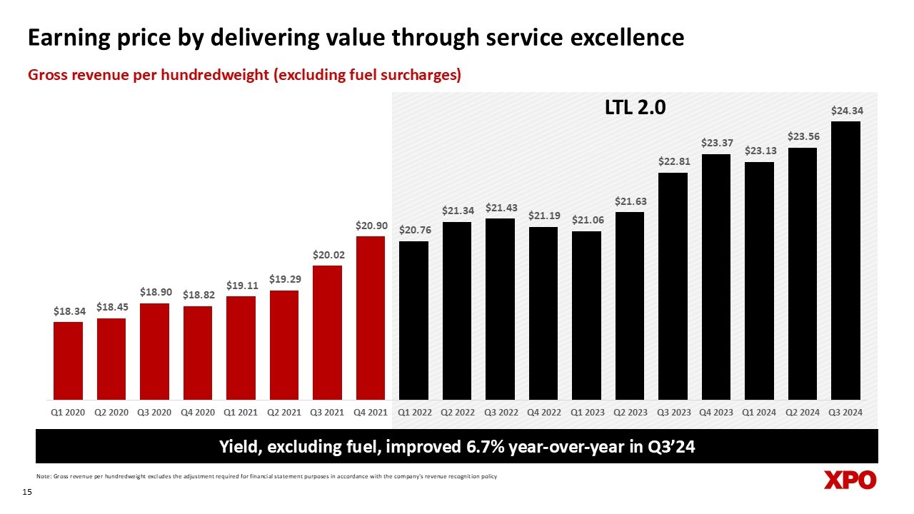 Investing in capacity that supports growth and high returns 14 Tractor age in years As of December 31 5.3 5.1 5.4 5.9 5.9 Note: Gross capex and revenue for North American LTL only 1 Excludes the company’s December 2023 acquisition of 28 service centers 5.0 LTL 2.0 $145 $197 $145 $197 $424 $581 3.8% 5.2% 4.1% 4.8% 9.1% 12.4% 0.0% 2.0% 4.0% 6.0% 8.0% 10.0% 12.0% 14.0% $- $200 $400 $600 $800 2018 2019 2020 2021 2022 2023 Gross capex as a % of revenue Gross capex ($ millions) 1 Reduced average fleet age to 4.2 years with addition of nearly 2,000 new tractors YTD through Q3’24