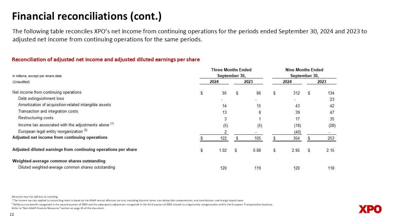 Financial reconciliations The following table reconciles XPO’s net income from continuing operations for the periods ended September 30, 2024 and 2023 to adjusted EBITDA for the same periods. 21 Reconciliation of net income to adjusted EBITDA Amounts may not foot due to rounding Refer to “Non - GAAP Financial Measures” section on page 24 of this document In millions (Unaudited) Change % Change % Net income from continuing operations $ 95 $ 86 10.5% $ 312 $ 134 132.8% Debt extinguishment loss - - - 23 Interest expense 56 41 170 126 Income tax provision 40 31 60 48 Depreciation and amortization expense 126 110 365 318 Transaction and integration costs 13 8 39 47 Restructuring costs 3 1 17 35 Other - 1 - 1 Adjusted EBITDA $ 333 $ 278 19.8% $ 964 $ 732 31.7% Nine Months Ended September 30, 2024 2023 Three Months Ended September 30, 2024 2023