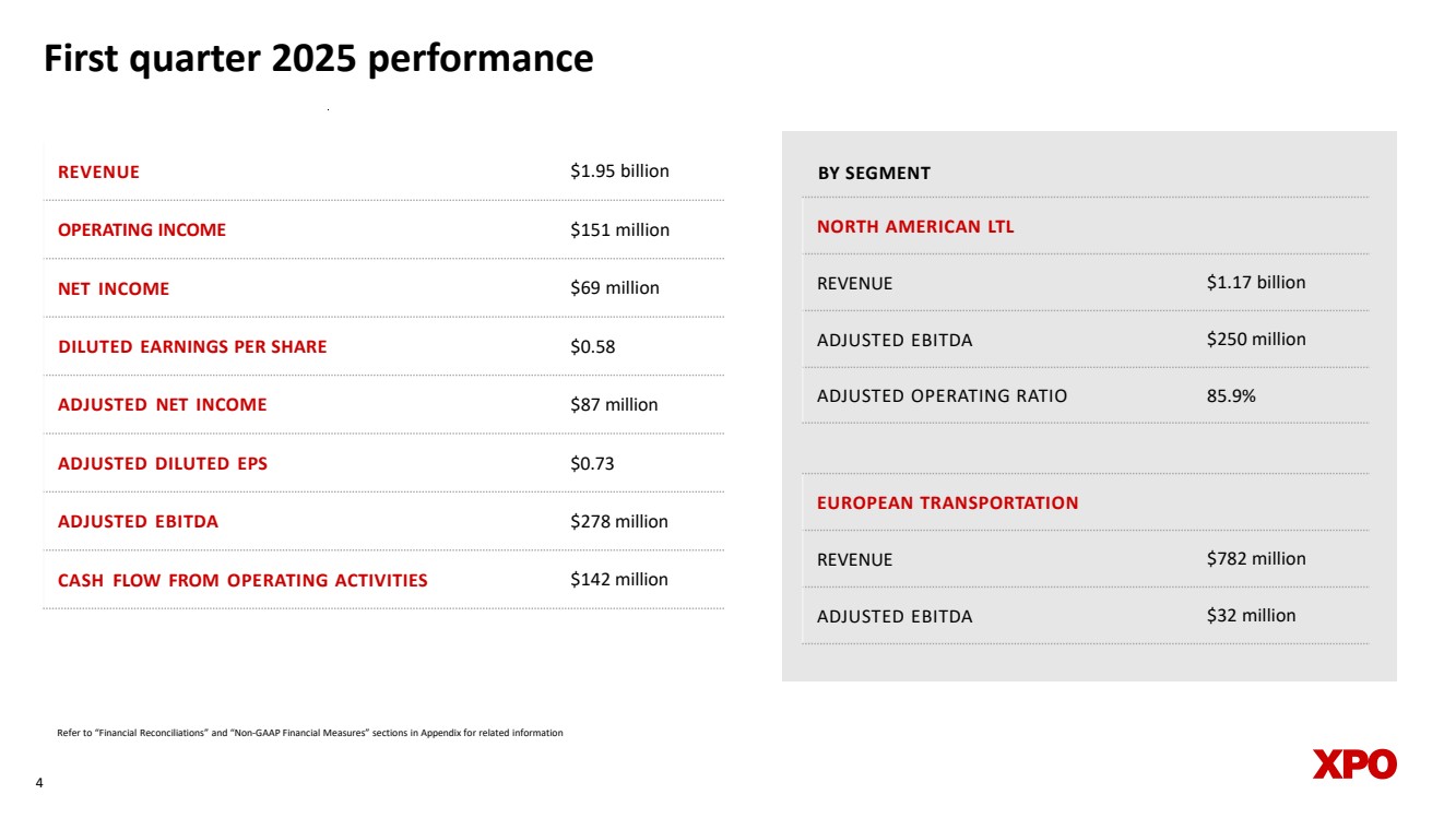 First quarter 2025 highlights XPO operating income of $151 million, up 9% YoY LTL adjusted operating ratio of 85.9%, improved by 30 bps sequentially LTL purchased transportation expense reduced by 53% YoY LTL linehaul miles outsourced to third - party carriers reduced by 940 bps YoY LTL yield, excluding fuel, up 6.9% YoY LTL revenue per shipment, excluding fuel, up 5.2% YoY LTL damages at lowest level in company history LTL on - time performance improved YoY for the 12th consecutive quarter Improved LTL adjusted OR by 370 bps over two years, in a historically soft freight environment Refer to “Financial Reconciliations” and “Non - GAAP Financial Measures” sections in Appendix for related information 3