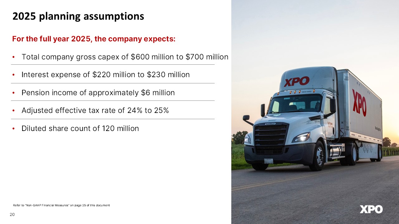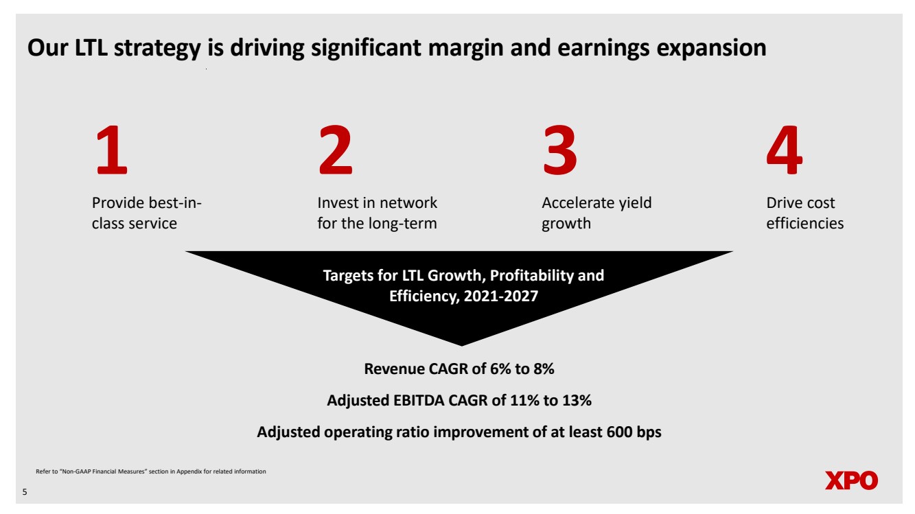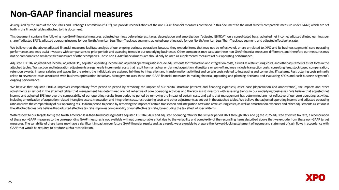Non - GAAP financial measures As required by the rules of the Securities and Exchange Commission (“SEC”), we provide reconciliations of the non - GAAP financial measures contained in this document to the most directly comparable measure under GAAP, which are set forth in the financial tables attached to this document . This document contains the following non - GAAP financial measures : adjusted earnings before interest, taxes, depreciation and amortization (“adjusted EBITDA”) on a consolidated basis ; adjusted net income ; adjusted diluted earnings per share ("adjusted EPS") ; adjusted operating income for our North American Less - Than - Truckload segment ; adjusted operating ratio for our North American Less - Than - Truckload segment ; and adjusted effective tax rate . We believe that the above adjusted financial measures facilitate analysis of our ongoing business operations because they exclude items that may not be reflective of, or are unrelated to, XPO and its business segments’ core operating performance, and may assist investors with comparisons to prior periods and assessing trends in our underlying businesses . Other companies may calculate these non - GAAP financial measures differently, and therefore our measures may not be comparable to similarly titled measures of other companies . These non - GAAP financial measures should only be used as supplemental measures of our operating performance . Adjusted EBITDA, adjusted net income, adjusted EPS, adjusted operating income and adjusted operating ratio include adjustments for transaction and integration costs, as well as restructuring costs, and other adjustments as set forth in the attached tables . Transaction and integration adjustments are generally incremental costs that result from an actual or planned acquisition, divestiture or spin - off and may include transaction costs, consulting fees, stock - based compensation, retention awards, internal salaries and wages (to the extent the individuals are assigned full - time to integration and transformation activities) and certain costs related to integrating and converging IT systems . Restructuring costs primarily relate to severance costs associated with business optimization initiatives . Management uses these non - GAAP financial measures in making financial, operating and planning decisions and evaluating XPO’s and each business segment’s ongoing performance . We believe that adjusted EBITDA improves comparability from period to period by removing the impact of our capital structure (interest and financing expenses), asset base (depreciation and amortization), tax impacts and other adjustments as set out in the attached tables that management has determined are not reflective of core operating activities and thereby assist investors with assessing trends in our underlying businesses . We believe that adjusted net income and adjusted EPS improve the comparability of our operating results from period to period by removing the impact of certain costs and gains that management has determined are not reflective of our core operating activities, including amortization of acquisition - related intangible assets, transaction and integration costs, restructuring costs and other adjustments as set out in the attached tables . We believe that adjusted operating income and adjusted operating ratio improve the comparability of our operating results from period to period by removing the impact of certain transaction and integration costs and restructuring costs, as well as amortization expenses and other adjustments as set out in the attached tables . We believe that adjusted effective tax rate improves comparability of our effective tax rate, by excluding the tax effect of special items . With respect to our targets for : ( i ) the North American less - than - truckload segment’s adjusted EBITDA CAGR and adjusted operating ratio for the six - year period 2021 through 2027 and (ii) the 2025 adjusted effective tax rate, a reconciliation of these non - GAAP measures to the corresponding GAAP measures is not available without unreasonable effort due to the variability and complexity of the reconciling items described above that we exclude from these non - GAAP target measures . The variability of these items may have a significant impact on our future GAAP financial results and, as a result, we are unable to prepare the forward - looking statement of income and statement of cash flows in accordance with GAAP that would be required to produce such a reconciliation . 25