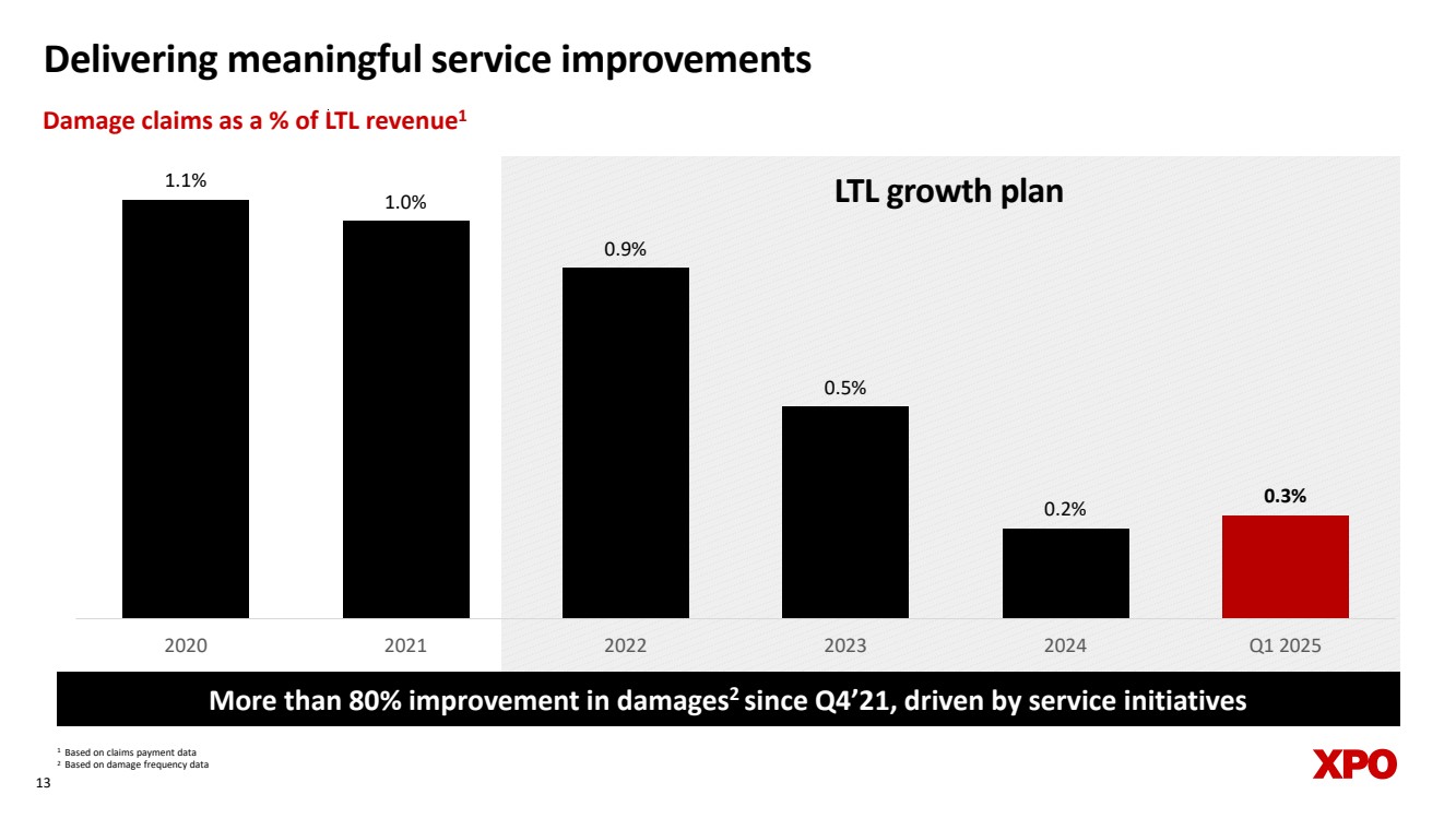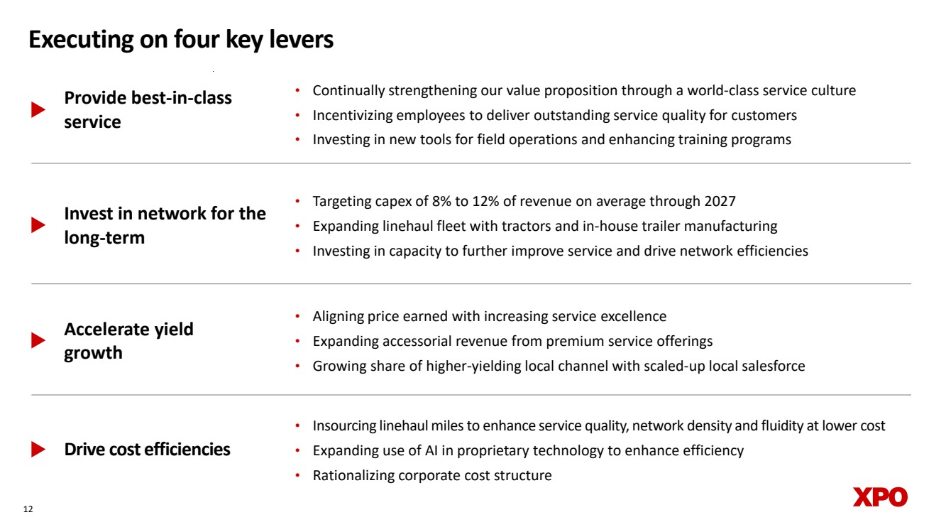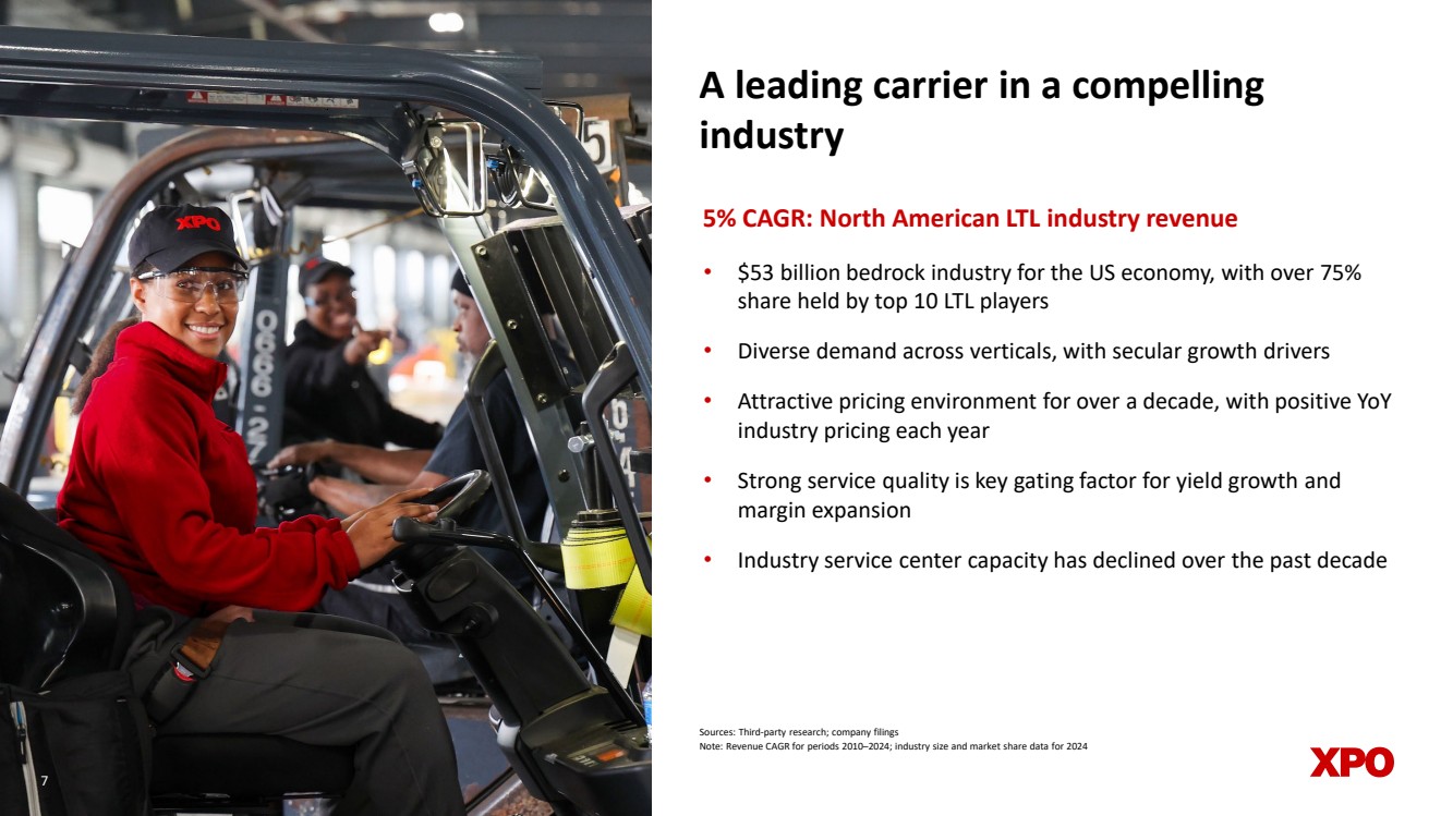 2 Forward - looking statements This document includes forward - looking statements within the meaning of Section 27 A of the Securities Act of 1933 , as amended, and Section 21 E of the Securities Exchange Act of 1934 , as amended, including statements relating to our full year 2025 expectations of gross capex, interest expense, pension income, adjusted effective tax rate, and diluted share count, and future financial targets of North American LTL revenue CAGR, adjusted EBITDA CAGR, adjusted operating ratio improvement, and capex as a percentage of revenue . All statements other than statements of historical fact are, or may be deemed to be, forward - looking statements . In some cases, forward - looking statements can be identified by the use of forward - looking terms such as “anticipate,” “estimate,” “believe,” “continue,” “could,” “intend,” “may,” “plan,” “potential,” “predict,” “should,” “will,” “expect,” “objective,” “projection,” “forecast,” “goal,” “guidance,” “outlook,” “effort,” “target,” “trajectory” or the negative of these terms or other comparable terms . These forward - looking statements are based on certain assumptions and analyses made by us in light of our experience and our perception of historical trends, current conditions and expected future developments, as well as other factors we believe are appropriate in the circumstances . These forward - looking statements are subject to known and unknown risks, uncertainties and assumptions that may cause actual results, levels of activity, performance or achievements to be materially different from any future results, levels of activity, performance or achievements expressed or implied by such forward - looking statements . Factors that might cause or contribute to a material difference include the risks discussed in our filings with the SEC, and the following : the effects of business, economic, political, legal, and regulatory impacts or conflicts upon our operations ; supply chain disruptions and shortages, strains on production or extraction of raw materials, cost inflation and labor and equipment shortages ; our ability to align our investments in capital assets, including equipment, service centers, and warehouses to our customers’ demands ; our ability to implement our cost and revenue initiatives and realize growth and expansion as a result of those initiatives ; the effectiveness of our action plan, and other management actions, to improve our North American LTL business ; our ability to continue insourcing linehaul in ways that enhance our network efficiency and productivity ; the anticipated impact of a freight market recovery on our business ; our ability to benefit from a sale, spin - off or other divestiture of one or more business units or to successfully integrate and realize anticipated synergies, cost savings and profit opportunities from acquired companies ; goodwill impairment ; issues related to compliance with data protection laws, competition laws, and intellectual property laws ; fluctuations in currency exchange rates, fuel prices and fuel surcharges ; the expected benefits of the spin - offs of GXO Logistics, Inc . and RXO, Inc .; our ability to develop and implement proprietary technology and suitable information technology systems ; the impact of potential cyber - attacks and information technology or data security breaches or failures ; our ability to repurchase shares on favorable terms ; our indebtedness ; our ability to raise debt and equity capital ; fluctuations in interest rates ; seasonal fluctuations ; our ability to maintain positive relationships with our network of third - party transportation providers ; our ability to attract and retain management talent and key employees including qualified drivers ; labor matters ; litigation ; competition ; and our ability to deliver pricing growth driven by service quality . All forward - looking statements set forth in this document are qualified by these cautionary statements and there can be no assurance that the actual results or developments anticipated by us will be realized or, even if substantially realized, that they will have the expected consequences to or effects on us or our business or operations . Forward - looking statements set forth in this document speak only as of the date hereof, and we do not undertake any obligation to update forward - looking statements except to the extent required by law . Non - GAAP financial measures This presentation contains non - GAAP financial measures . For a description of these non - GAAP financial measures, including a reconciliation to the most comparable measure under GAAP, see the Appendix to this presentation .