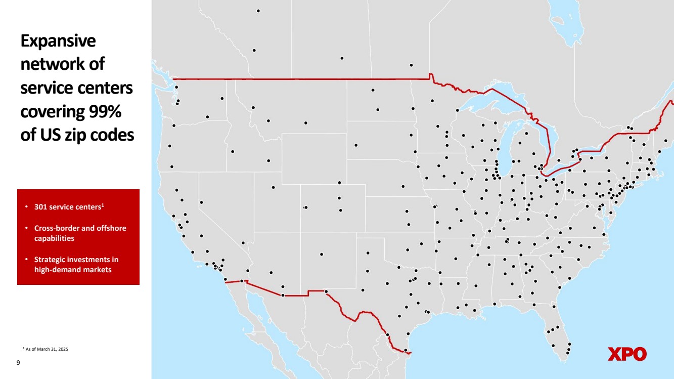 A major player in the supply - chain ecosystem Note: Company data for North American LTL segment only as of March 31, 2025, unless otherwise noted as 2024 (full year) 4th largest LTL carrier by 2024 revenue 14.6% of 2024 revenue allocated to gross capex 13 million 2024 s hipments 36,000 customers served $4.9 billion 2024 revenue 9 % 2024 industry share 8 13,0 0 0 d rivers 34,0 0 0 t railers 18 billion 2024 pounds of freight 661 million 2024 l inehaul miles run 2 3 ,0 0 0 e mployees 301 service centers quarterly (bring back