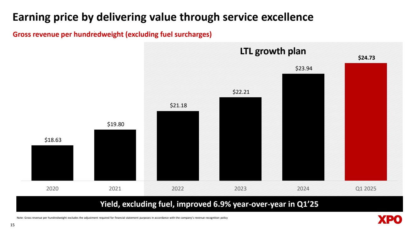 $145 $197 $145 $197 $424 $581 $715 3.8% 5.2% 4.1% 4.8% 9.1% 12.4% 14.6% 0.0% 2.0% 4.0% 6.0% 8.0% 10.0% 12.0% 14.0% 16.0% $- $200 $400 $600 $800 $1,000 2018 2019 2020 2021 2022 2023 2024 Gross capex as a % of revenue Gross capex ($ millions) Investing in capacity that supports growth and high returns 14 Tractor age in years As of December 31 5.3 5.1 5.4 5.9 5.9 Note: Gross capex and revenue for North American LTL only 1 Excludes the company’s December 2023 acquisition of 28 service centers 5.0 1 Reduced average fleet age to 4.0 years in Q1’25 4.1 LTL growth plan