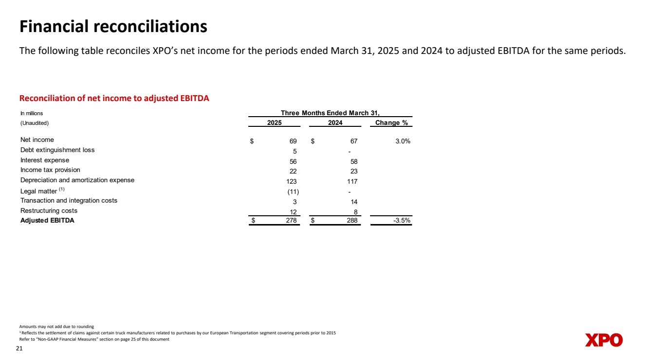 Financial reconciliations The following table reconciles XPO’s net income for the periods ended March 31, 2025 and 2024 to adjusted EBITDA for the same periods. 21 Reconciliation of net income to adjusted EBITDA Amounts may not add due to rounding 1 Reflects the settlement of claims against certain truck manufacturers related to purchases by our European Transportation seg men t covering periods prior to 2015 Refer to “Non - GAAP Financial Measures” section on page 25 of this document In millions (Unaudited) Change % Net income $ 69 $ 67 3.0% Debt extinguishment loss 5 - Interest expense 56 58 Income tax provision 22 23 Depreciation and amortization expense 123 117 Legal matter (1) (11) - Transaction and integration costs 3 14 Restructuring costs 12 8 Adjusted EBITDA $ 278 $ 288 -3.5% Three Months Ended March 31, 2025 2024