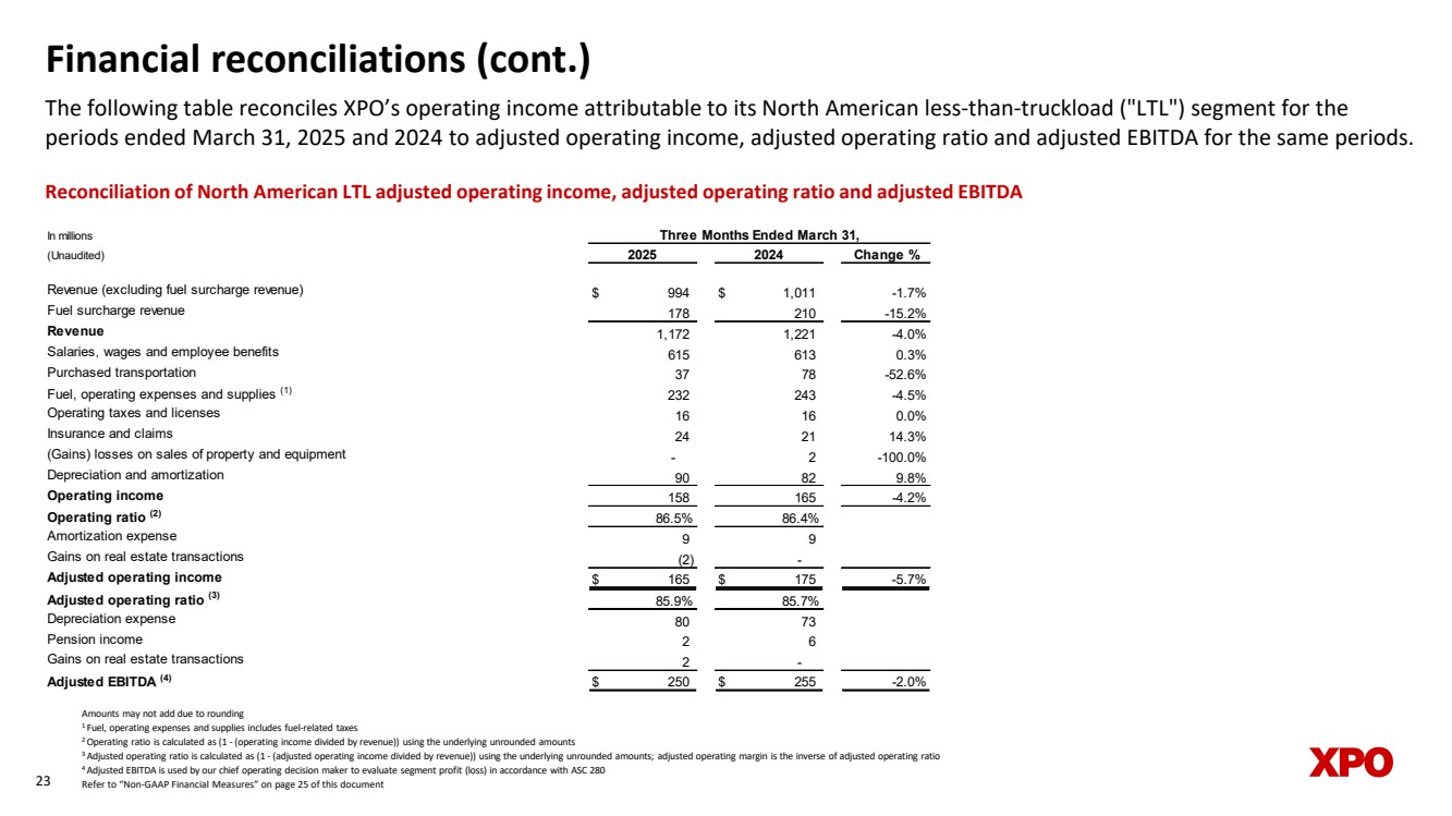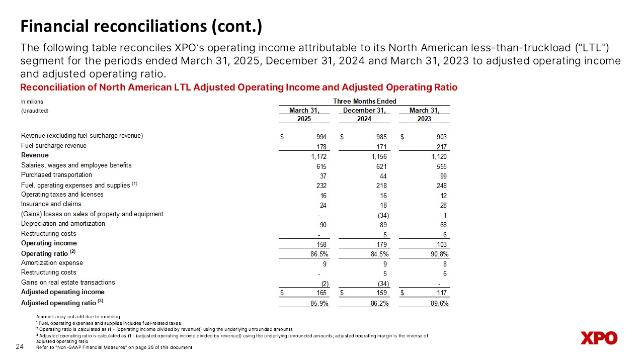 Financial reconciliations (cont.) The following table reconciles XPO’s operating income attributable to its North American less - than - truckload ("LTL") segment for the periods ended March 31, 2025 and 2024 to adjusted operating income, adjusted operating ratio and adjusted EBITDA for the same periods. 23 Reconciliation of N orth American LTL adjusted operating income, adjusted operating ratio and adjusted EBITDA Amounts may not add due to rounding 1 Fuel, operating expenses and supplies includes fuel - related taxes 2 Operating ratio is calculated as (1 - (operating income divided by revenue)) using the underlying unrounded amounts 3 Adjusted operating ratio is calculated as (1 - (adjusted operating income divided by revenue)) using the underlying unrounded am ounts; adjusted operating margin is the inverse of adjusted operating ratio 4 Adjusted EBITDA is used by our chief operating decision maker to evaluate segment profit (loss) in accordance with ASC 280 Refer to “Non - GAAP Financial Measures” on page 25 of this document In millions (Unaudited) Change % Revenue (excluding fuel surcharge revenue) $ 994 $ 1,011 -1.7% Fuel surcharge revenue 178 210 -15.2% Revenue 1,172 1,221 -4.0% Salaries, wages and employee benefits 615 613 0.3% Purchased transportation 37 78 -52.6% Fuel, operating expenses and supplies (1) 232 243 -4.5% Operating taxes and licenses 16 16 0.0% Insurance and claims 24 21 14.3% (Gains) losses on sales of property and equipment - 2 -100.0% Depreciation and amortization 90 82 9.8% Operating income 158 165 -4.2% Operating ratio (2) 86.5% 86.4% Amortization expense 9 9 Gains on real estate transactions (2) - Adjusted operating income $ 165 $ 175 -5.7% Adjusted operating ratio (3) 85.9% 85.7% Depreciation expense 80 73 Pension income 2 6 Gains on real estate transactions 2 - Adjusted EBITDA (4) $ 250 $ 255 -2.0% 2025 2024 Three Months Ended March 31,