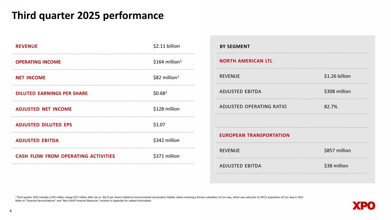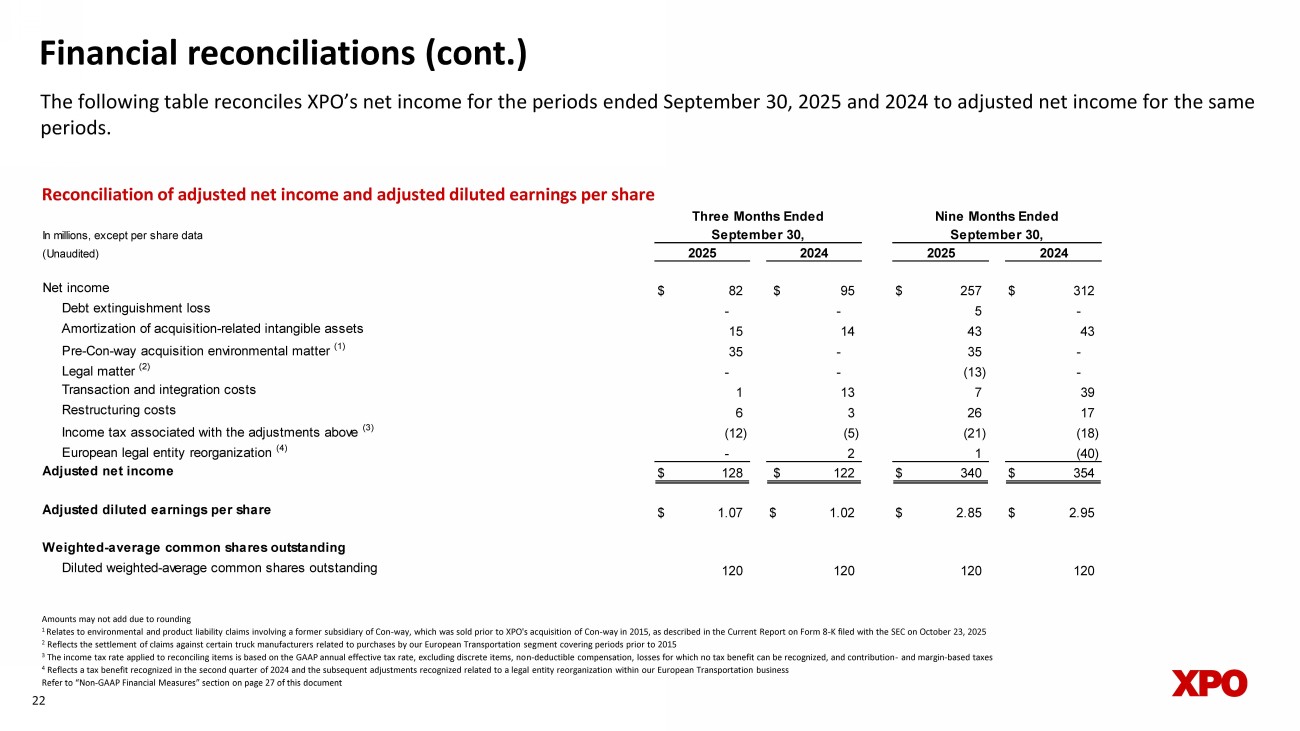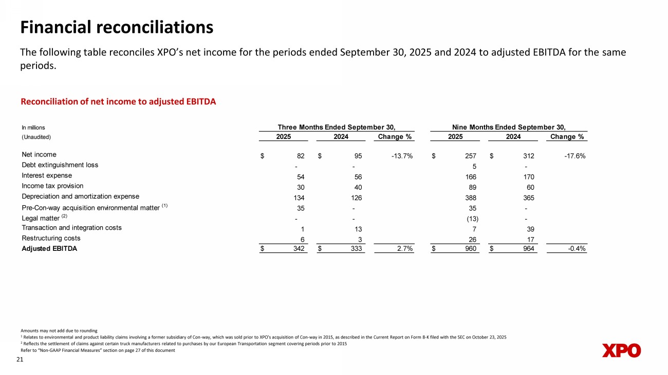 Financial reconciliations The following table reconciles XPO’s net income for the periods ended September 30, 2025 and 2024 to adjusted EBITDA for the same periods. 21 Reconciliation of net income to adjusted EBITDA Amounts may not add due to rounding 1 Relates to environmental and product liability claims involving a former subsidiary of Con - way, which was sold prior to XPO's a cquisition of Con - way in 2015, as described in the Current Report on Form 8 - K filed with the SEC on October 23, 2025 2 Reflects the settlement of claims against certain truck manufacturers related to purchases by our European Transportation seg me nt covering periods prior to 2015 Refer to “Non - GAAP Financial Measures” section on page 27 of this document In millions (Unaudited) Change % Change % Net income $ 82 $ 95 -13.7% $ 257 $ 312 -17.6% Debt extinguishment loss - - 5 - Interest expense 54 56 166 170 Income tax provision 30 40 89 60 Depreciation and amortization expense 134 126 388 365 Pre-Con-way acquisition environmental matter (1) 35 - 35 - Legal matter (2) - - (13) - Transaction and integration costs 1 13 7 39 Restructuring costs 6 3 26 17 Adjusted EBITDA $ 342 $ 333 2.7% $ 960 $ 964 -0.4% Three Months Ended September 30, 2025 2024 Nine Months Ended September 30, 2025 2024