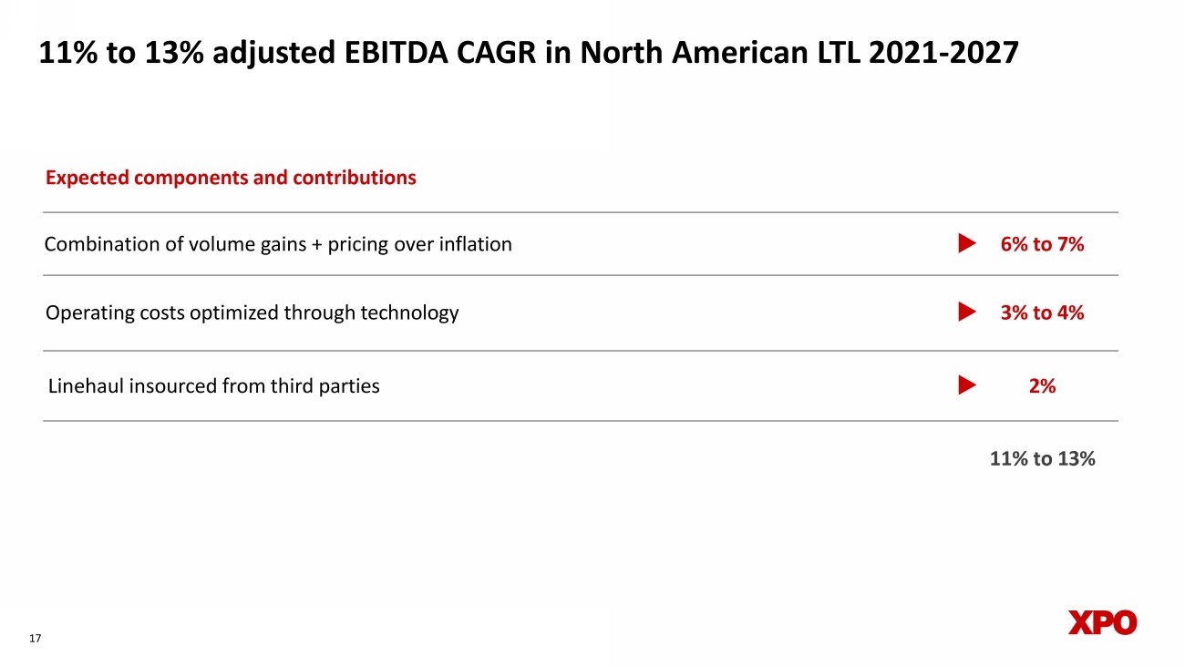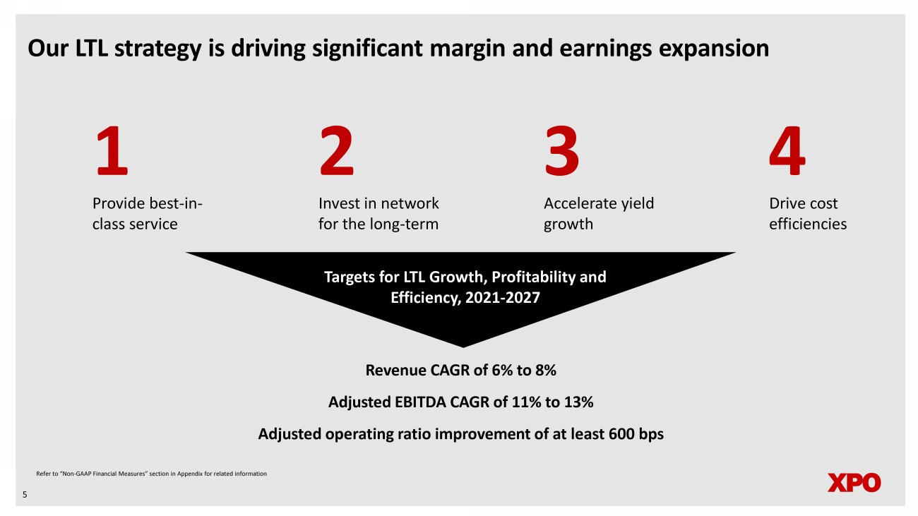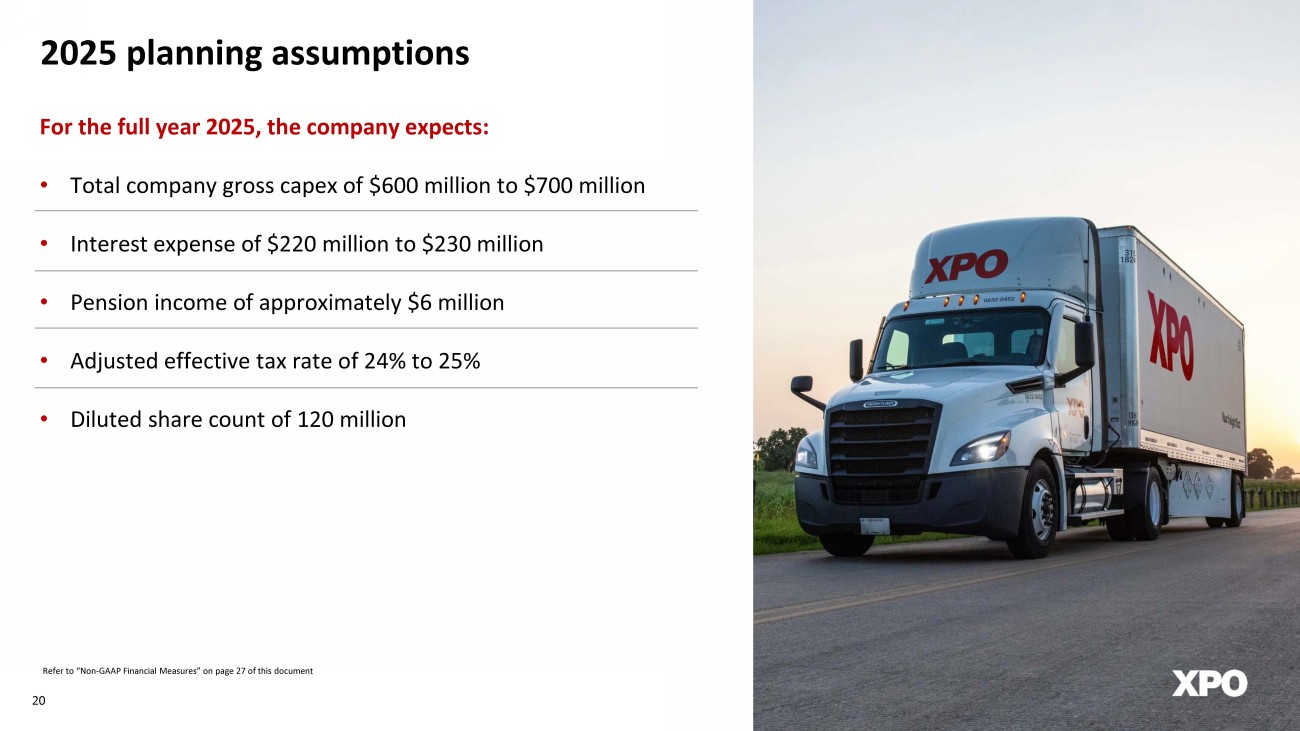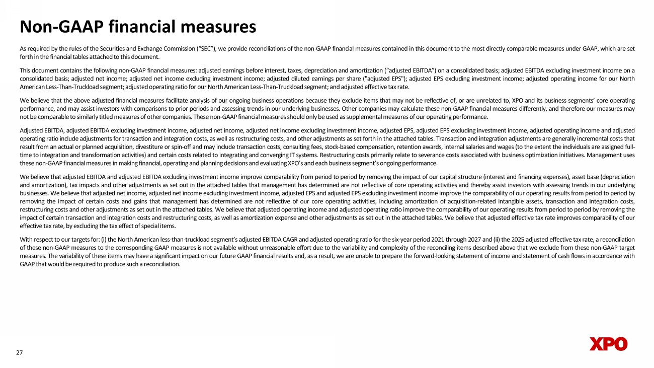 Non - GAAP financial measures As required by the rules of the Securities and Exchange Commission (“SEC”), we provide reconciliations of the non - GAAP financial measures contained in this document to the most directly comparable measures under GAAP, which are set forth in the financial tables attached to this document . This document contains the following non - GAAP financial measures : adjusted earnings before interest, taxes, depreciation and amortization (“adjusted EBITDA”) on a consolidated basis ; adjusted EBITDA excluding investment income on a consolidated basis ; adjusted net income ; adjusted net income excluding investment income ; adjusted diluted earnings per share ("adjusted EPS") ; adjusted EPS excluding investment income ; adjusted operating income for our North American Less - Than - Truckload segment ; adjusted operating ratio for our North American Less - Than - Truckload segment ; and adjusted effective tax rate . We believe that the above adjusted financial measures facilitate analysis of our ongoing business operations because they exclude items that may not be reflective of, or are unrelated to, XPO and its business segments’ core operating performance, and may assist investors with comparisons to prior periods and assessing trends in our underlying businesses . Other companies may calculate these non - GAAP financial measures differently, and therefore our measures may not be comparable to similarly titled measures of other companies . These non - GAAP financial measures should only be used as supplemental measures of our operating performance . Adjusted EBITDA, adjusted EBITDA excluding investment income, adjusted net income, adjusted net income excluding investment income, adjusted EPS, adjusted EPS excluding investment income, adjusted operating income and adjusted operating ratio include adjustments for transaction and integration costs, as well as restructuring costs, and other adjustments as set forth in the attached tables . Transaction and integration adjustments are generally incremental costs that result from an actual or planned acquisition, divestiture or spin - off and may include transaction costs, consulting fees, stock - based compensation, retention awards, internal salaries and wages (to the extent the individuals are assigned full - time to integration and transformation activities) and certain costs related to integrating and converging IT systems . Restructuring costs primarily relate to severance costs associated with business optimization initiatives . Management uses these non - GAAP financial measures in making financial, operating and planning decisions and evaluating XPO’s and each business segment’s ongoing performance . We believe that adjusted EBITDA and adjusted EBITDA excluding investment income improve comparability from period to period by removing the impact of our capital structure (interest and financing expenses), asset base (depreciation and amortization), tax impacts and other adjustments as set out in the attached tables that management has determined are not reflective of core operating activities and thereby assist investors with assessing trends in our underlying businesses . We believe that adjusted net income, adjusted net income excluding investment income, adjusted EPS and adjusted EPS excluding investment income improve the comparability of our operating results from period to period by removing the impact of certain costs and gains that management has determined are not reflective of our core operating activities, including amortization of acquisition - related intangible assets, transaction and integration costs, restructuring costs and other adjustments as set out in the attached tables . We believe that adjusted operating income and adjusted operating ratio improve the comparability of our operating results from period to period by removing the impact of certain transaction and integration costs and restructuring costs, as well as amortization expense and other adjustments as set out in the attached tables . We believe that adjusted effective tax rate improves comparability of our effective tax rate, by excluding the tax effect of special items . With respect to our targets for : ( i ) the North American less - than - truckload segment’s adjusted EBITDA CAGR and adjusted operating ratio for the six - year period 2021 through 2027 and (ii) the 2025 adjusted effective tax rate, a reconciliation of these non - GAAP measures to the corresponding GAAP measures is not available without unreasonable effort due to the variability and complexity of the reconciling items described above that we exclude from these non - GAAP target measures . The variability of these items may have a significant impact on our future GAAP financial results and, as a result, we are unable to prepare the forward - looking statement of income and statement of cash flows in accordance with GAAP that would be required to produce such a reconciliation . 27