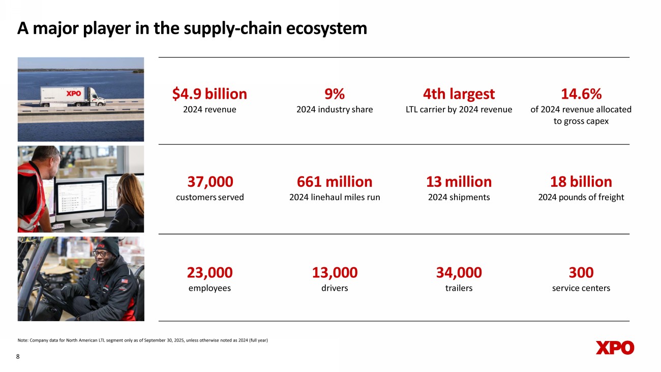 A major player in the supply - chain ecosystem Note: Company data for North American LTL segment only as of September 30, 2025, unless otherwise noted as 2024 (full year) 4th largest LTL carrier by 2024 revenue 14.6% of 2024 revenue allocated to gross capex 13 million 2024 s hipments 37,000 customers served $4.9 billion 2024 revenue 9 % 2024 industry share 8 13,0 0 0 d rivers 34,0 0 0 t railers 18 billion 2024 pounds of freight 661 million 2024 l inehaul miles run 2 3 ,0 0 0 e mployees 300 service centers quarterly (bring back