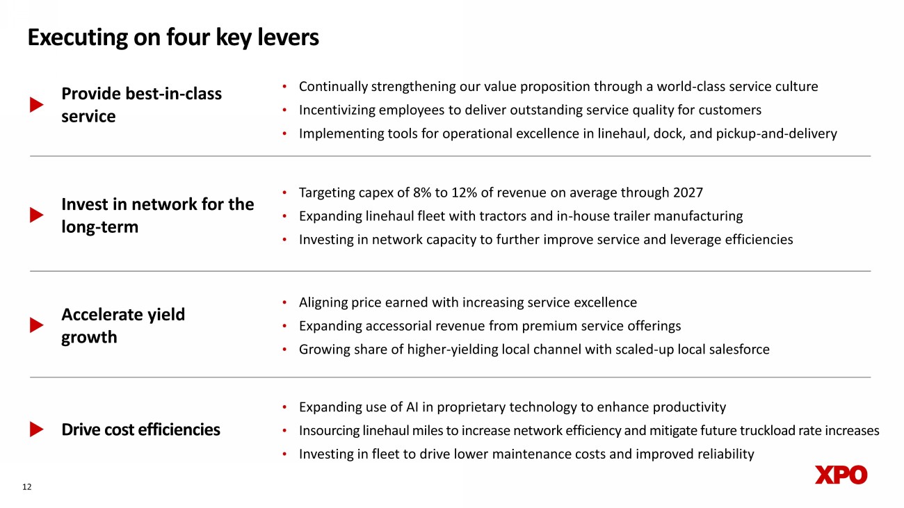 Provide best - in - class service Accelerate yield growth Drive cost efficiencies • Aligning price earned with increasing service excellence • Expanding accessorial revenue from premium service offerings • Growing share of higher - yielding local channel with scaled - up local salesforce • Expanding use of AI in proprietary technology to enhance productivity • Insourcing linehaul miles to increase network efficiency and mitigate future truckload rate increases • Investing in fleet to drive lower maintenance costs and improved reliability 12 Executing on four key levers • Continually strengthening our value proposition through a world - class service culture • Incentivizing employees to deliver outstanding service quality for customers • Implementing tools for operational excellence in linehaul, dock, and pickup - and - delivery Invest in network for the long - term • Targeting capex of 8% to 12% of revenue on average through 2027 • Expanding linehaul fleet with tractors and in - house trailer manufacturing • Investing in network capacity to further improve service and leverage efficiencies