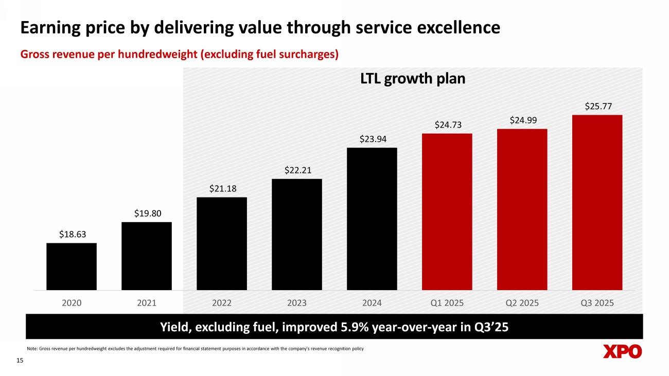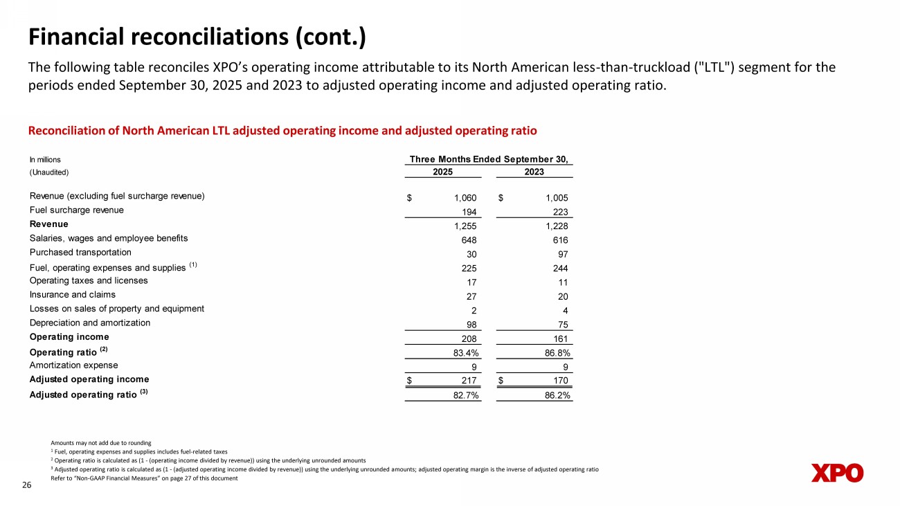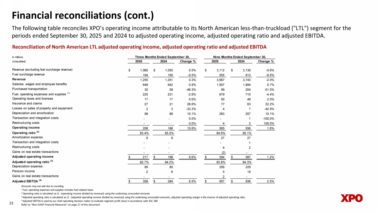 Financial reconciliations (cont.) The following table reconciles XPO’s operating income attributable to its North American less - than - truckload ("LTL") segment for the periods ended September 30, 2025 and 2024 to adjusted operating income, adjusted operating ratio and adjusted EBITDA. 23 Reconciliation of North American LTL adjusted operating income, adjusted operating ratio and adjusted EBITDA Amounts may not add due to rounding 1 Fuel, operating expenses and supplies includes fuel - related taxes 2 Operating ratio is calculated as (1 - (operating income divided by revenue)) using the underlying unrounded amounts 3 Adjusted operating ratio is calculated as (1 - (adjusted operating income divided by revenue)) using the underlying unrounded am ounts; adjusted operating margin is the inverse of adjusted operating ratio 4 Adjusted EBITDA is used by our chief operating decision maker to evaluate segment profit (loss) in accordance with ASC 280 Refer to “Non - GAAP Financial Measures” on page 27 of this document In millions (Unaudited) Change % Change % Revenue (excluding fuel surcharge revenue) $ 1,060 $ 1,055 0.5% $ 3,112 $ 3,130 -0.6% Fuel surcharge revenue 194 195 -0.5% 555 613 -9.5% Revenue 1,255 1,251 0.3% 3,667 3,743 -2.0% Salaries, wages and employee benefits 648 642 0.9% 1,907 1,894 0.7% Purchased transportation 30 58 -48.3% 99 204 -51.5% Fuel, operating expenses and supplies (1) 225 231 -2.6% 679 710 -4.4% Operating taxes and licenses 17 17 0.0% 50 49 2.0% Insurance and claims 27 21 28.6% 77 63 22.2% Losses on sales of property and equipment 2 3 -33.3% 4 7 -42.9% Depreciation and amortization 98 89 10.1% 283 257 10.1% Transaction and integration costs - - 0.0% - 1 -100.0% Restructuring costs - - 0.0% 4 2 100.0% Operating income 208 188 10.6% 565 556 1.6% Operating ratio (2) 83.4% 85.0% 84.6% 85.1% Amortization expense 9 9 27 27 Transaction and integration costs - - - 1 Restructuring costs - - 4 2 Gains on real estate transactions - - (2) - Adjusted operating income $ 217 $ 198 9.6% $ 594 $ 587 1.2% Adjusted operating ratio (3) 82.7% 84.2% 83.8% 84.3% Depreciation expense 89 80 256 229 Pension income 2 6 5 19 Gains on real estate transactions - - 2 - Adjusted EBITDA (4) $ 308 $ 284 8.5% $ 857 $ 836 2.5% Nine Months Ended September 30, 2025 20242025 2024 Three Months Ended September 30,