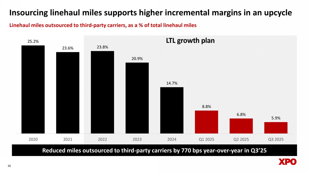 $18.63 $19.80 $21.18 $22.21 $23.94 $24.73 $24.99 $25.77 2020 2021 2022 2023 2024 Q1 2025 Q2 2025 Q3 2025 Earning price by delivering value through service excellence 15 Note: Gross revenue per hundredweight excludes the adjustment required for financial statement purposes in accordance with th e c ompany's revenue recognition policy Yield, excluding fuel, improved 5.9% year - over - year in Q3’25 Gross revenue per hundredweight (excluding fuel surcharges) LTL growth plan
