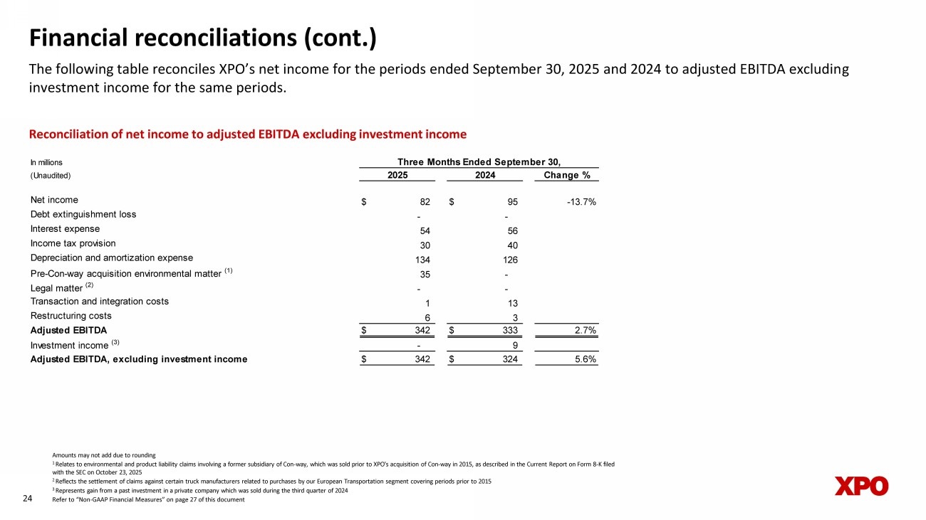 Financial reconciliations (cont.) The following table reconciles XPO’s net income for the periods ended September 30, 2025 and 2024 to adjusted EBITDA excluding investment income for the same periods. 24 Reconciliation of net income to adjusted EBITDA excluding investment income Amounts may not add due to rounding 1 Relates to environmental and product liability claims involving a former subsidiary of Con - way, which was sold prior to XPO's ac quisition of Con - way in 2015, as described in the Current Report on Form 8 - K filed with the SEC on October 23, 2025 2 Reflects the settlement of claims against certain truck manufacturers related to purchases by our European Transportation seg men t covering periods prior to 2015 3 Represents gain from a past investment in a private company which was sold during the third quarter of 2024. Refer to “Non - GAAP Financial Measures” on page 27 of this document In millions (Unaudited) Change % Net income $ 82 $ 95 -13.7% Debt extinguishment loss - - Interest expense 54 56 Income tax provision 30 40 Depreciation and amortization expense 134 126 Pre-Con-way acquisition environmental matter (1) 35 - Legal matter (2) - - Transaction and integration costs 1 13 Restructuring costs 6 3 Adjusted EBITDA $ 342 $ 333 2.7% Investment income (3) - 9 Adjusted EBITDA, excluding investment income $ 342 $ 324 5.6% Three Months Ended September 30, 2025 2024