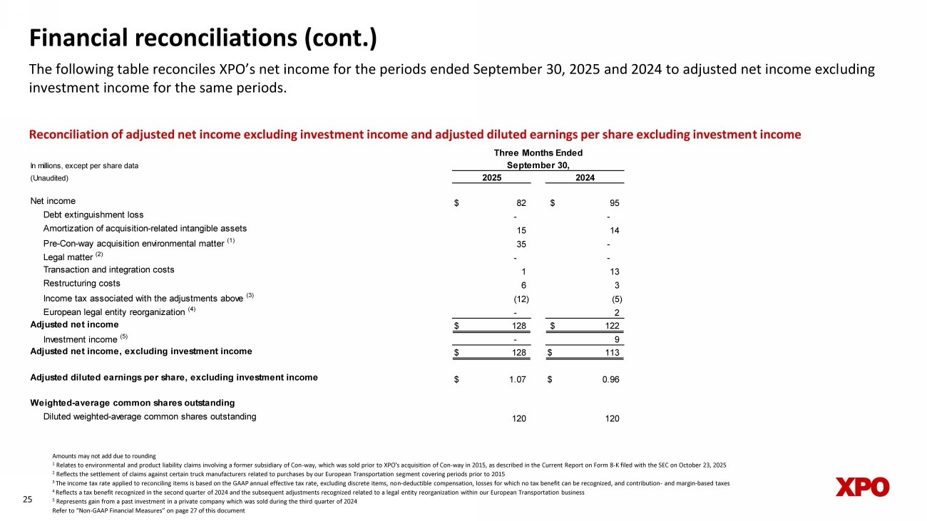 Financial reconciliations (cont.) The following table reconciles XPO’s net income for the periods ended September 30, 2025 and 2024 to adjusted net income excluding investment income for the same periods. 25 Reconciliation of adjusted net income excluding investment income and adjusted diluted earnings per share excluding investment income Amounts may not add due to rounding 1 Relates to environmental and product liability claims involving a former subsidiary of Con - way, which was sold prior to XPO's a cquisition of Con - way in 2015, as described in the Current Report on Form 8 - K filed with the SEC on October 23, 2025 2 Reflects the settlement of claims against certain truck manufacturers related to purchases by our European Transportation seg me nt covering periods prior to 2015 3 The income tax rate applied to reconciling items is based on the GAAP annual effective tax rate, excluding discrete items, no n - d eductible compensation, losses for which no tax benefit can be recognized, and contribution - and margin - based taxes 4 Reflects a tax benefit recognized in the second quarter of 2024 and the subsequent adjustments recognized related to a legal ent ity reorganization within our European Transportation business 5 Represents gain from a past investment in a private company which was sold during the third quarter of 2024. Refer to “Non - GAAP Financial Measures” on page 27 of this document In millions, except per share data (Unaudited) Net income $ 82 $ 95 Debt extinguishment loss - - Amortization of acquisition-related intangible assets 15 14 Pre-Con-way acquisition environmental matter (1) 35 - Legal matter (2) - - Transaction and integration costs 1 13 Restructuring costs 6 3 Income tax associated with the adjustments above (3) (12) (5) European legal entity reorganization (4) - 2 Adjusted net income $ 128 $ 122 Investment income (5) - 9 Adjusted net income, excluding investment income $ 128 $ 113 Adjusted diluted earnings per share, excluding investment income $ 1.07 $ 0.96 Weighted-average common shares outstanding Diluted weighted-average common shares outstanding 120 120 2025 2024 Three Months Ended September 30,