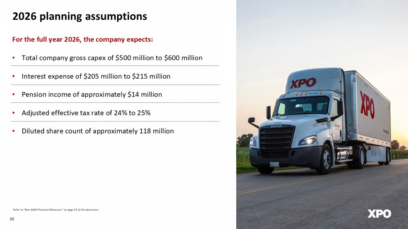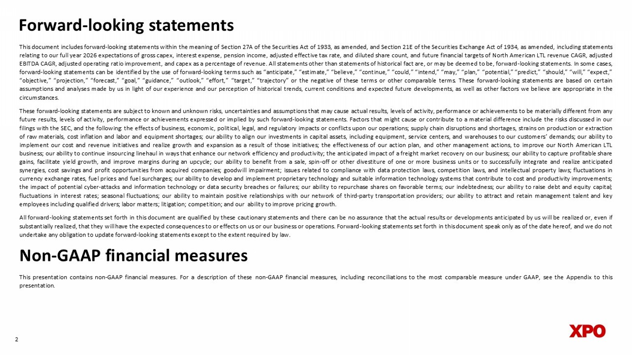 Non - GAAP financial measures As required by the rules of the Securities and Exchange Commission (“SEC”), we provide reconciliations of the non - GAAP financial measures contained in this document to the most directly comparable measures under GAAP, which are set forth in the financial tables attached to this document . This document contains the following non - GAAP financial measures : adjusted earnings before interest, taxes, depreciation and amortization (“adjusted EBITDA”) on a consolidated basis ; adjusted EBITDA, excluding gains on real estate transactions on a consolidated basis and for our North American Less - Than - Truckload segment ; adjusted net income ; adjusted diluted earnings per share ("adjusted EPS") ; adjusted EPS, excluding gains on real estate transactions ; adjusted operating income for our North American Less - Than - Truckload segment ; adjusted operating ratio for our North American Less - Than - Truckload segment ; and adjusted effective tax rate . We believe that the above adjusted financial measures facilitate analysis of our ongoing business operations because they exclude items that may not be reflective of, or are unrelated to, XPO and its business segments’ core operating performance, and may assist investors with comparisons to prior periods and assessing trends in our underlying businesses . Other companies may calculate these non - GAAP financial measures differently, and therefore our measures may not be comparable to similarly titled measures of other companies . These non - GAAP financial measures should only be used as supplemental measures of our operating performance . Adjusted EBITDA, adjusted EBITDA, excluding gains on real estate transactions, adjusted net income, adjusted EPS, adjusted EPS, excluding gains on real estate transactions, adjusted operating income and adjusted operating ratio include adjustments for transaction and integration costs, as well as restructuring costs, and other adjustments as set forth in the attached tables . Transaction and integration adjustments are generally incremental costs that result from an actual or planned acquisition, divestiture or spin - off and may include transaction costs, consulting fees, stock - based compensation, retention awards, internal salaries and wages (to the extent the individuals are assigned full - time to integration and transformation activities) and certain costs related to integrating and converging IT systems . Restructuring costs primarily relate to severance costs associated with business optimization initiatives . Management uses these non - GAAP financial measures in making financial, operating and planning decisions and evaluating XPO’s and each business segment’s ongoing performance . We believe that adjusted EBITDA and adjusted EBITDA, excluding gains on real estate transactions improve comparability from period to period by removing the impact of our capital structure (interest and financing expenses), asset base (depreciation and amortization), tax impacts and other adjustments as set out in the attached tables that management has determined are not reflective of core operating activities and thereby assist investors with assessing trends in our underlying businesses . We believe that adjusted net income, adjusted EPS and adjusted EPS, excluding gains on real estate transactions improve the comparability of our operating results from period to period by removing the impact of certain costs and gains that management has determined are not reflective of our core operating activities, including amortization of acquisition - related intangible assets, transaction and integration costs, restructuring costs and other adjustments as set out in the attached tables . We believe that adjusted operating income and adjusted operating ratio improve the comparability of our operating results from period to period by removing the impact of certain transaction and integration costs and restructuring costs, as well as amortization expense and other adjustments as set out in the attached tables . We believe that adjusted effective tax rate improves comparability of our effective tax rate, by excluding the tax effect of special items . With respect to our targets for : ( i ) the North American less - than - truckload segment’s adjusted EBITDA CAGR and adjusted operating ratio for the six - year period 2021 through 2027 and (ii) the 2026 adjusted effective tax rate, a reconciliation of these non - GAAP measures to the corresponding GAAP measures is not available without unreasonable effort due to the variability and complexity of the reconciling items described above that we exclude from these non - GAAP target measures . The variability of these items may have a significant impact on our future GAAP financial results and, as a result, we are unable to prepare the forward - looking statement of income and statement of cash flows in accordance with GAAP that would be required to produce such a reconciliation . 25
