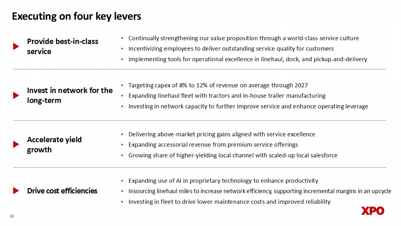 Provide best - in - class service Accelerate yield growth Drive cost efficiencies • Delivering above - market pricing gains aligned with service excellence • Expanding accessorial revenue from premium service offerings • Growing share of higher - yielding local channel with scaled - up local salesforce • Expanding use of AI in proprietary technology to enhance productivity • Insourcing linehaul miles to increase network efficiency, supporting incremental margins in an upcycle • Investing in fleet to drive lower maintenance costs and improved reliability 12 Executing on four key levers • Continually strengthening our value proposition through a world - class service culture • Incentivizing employees to deliver outstanding service quality for customers • Implementing tools for operational excellence in linehaul, dock, and pickup - and - delivery Invest in network for the long - term • Targeting capex of 8% to 12% of revenue on average through 2027 • Expanding linehaul fleet with tractors and in - house trailer manufacturing • Investing in network capacity to further improve service and enhance operating leverage