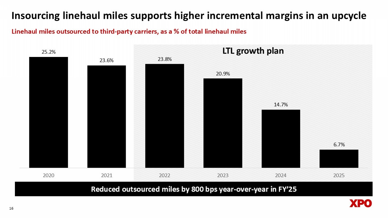 Earning price by delivering value through service excellence 15 Note: Gross revenue per hundredweight excludes the adjustment required for financial statement purposes in accordance with th e c ompany's revenue recognition policy. Yield, excluding fuel, improved 6.0% year - over - year in FY’25 Gross revenue per hundredweight (excluding fuel surcharges) LTL growth plan $18.63 $19.80 $21.18 $22.21 $23.94 $25.39 2020 2021 2022 2023 2024 2025