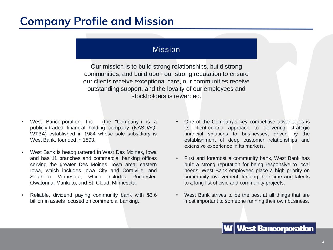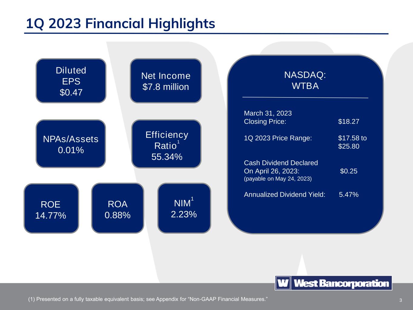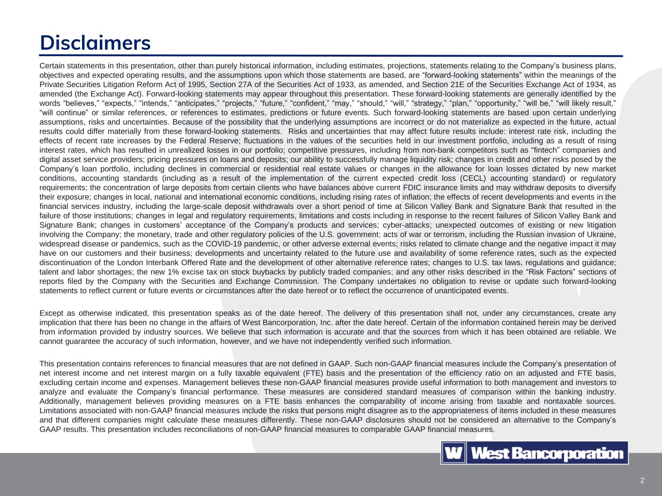 2 Certain statements in this presentation, other than purely historical information, including estimates, projections, statements relating to the Company’s business plans, objectives and expected operating results, and the assumptions upon which those statements are based, are “forward-looking statements” within the meanings of the Private Securities Litigation Reform Act of 1995, Section 27A of the Securities Act of 1933, as amended, and Section 21E of the Securities Exchange Act of 1934, as amended (the Exchange Act). Forward-looking statements may appear throughout this presentation. These forward-looking statements are generally identified by the words “believes,” “expects,” “intends,” “anticipates,” “projects,” “future,” “confident,” “may,” “should,” “will,” “strategy,” “plan,” “opportunity,” “will be,” “will likely result,” “will continue” or similar references, or references to estimates, predictions or future events. Such forward-looking statements are based upon certain underlying assumptions, risks and uncertainties. Because of the possibility that the underlying assumptions are incorrect or do not materialize as expected in the future, actual results could differ materially from these forward-looking statements. Risks and uncertainties that may affect future results include: interest rate risk, including the effects of recent rate increases by the Federal Reserve; fluctuations in the values of the securities held in our investment portfolio, including as a result of rising interest rates, which has resulted in unrealized losses in our portfolio; competitive pressures, including from non-bank competitors such as “fintech” companies and digital asset service providers; pricing pressures on loans and deposits; our ability to successfully manage liquidity risk; changes in credit and other risks posed by the Company’s loan portfolio, including declines in commercial or residential real estate values or changes in the allowance for loan losses dictated by new market conditions, accounting standards (including as a result of the implementation of the current expected credit loss (CECL) accounting standard) or regulatory requirements; the concentration of large deposits from certain clients who have balances above current FDIC insurance limits and may withdraw deposits to diversify their exposure; changes in local, national and international economic conditions, including rising rates of inflation; the effects of recent developments and events in the financial services industry, including the large-scale deposit withdrawals over a short period of time at Silicon Valley Bank and Signature Bank that resulted in the failure of those institutions; changes in legal and regulatory requirements, limitations and costs including in response to the recent failures of Silicon Valley Bank and Signature Bank; changes in customers’ acceptance of the Company’s products and services; cyber-attacks; unexpected outcomes of existing or new litigation involving the Company; the monetary, trade and other regulatory policies of the U.S. government; acts of war or terrorism, including the Russian invasion of Ukraine, widespread disease or pandemics, such as the COVID-19 pandemic, or other adverse external events; risks related to climate change and the negative impact it may have on our customers and their business; developments and uncertainty related to the future use and availability of some reference rates, such as the expected discontinuation of the London Interbank Offered Rate and the development of other alternative reference rates; changes to U.S. tax laws, regulations and guidance; talent and labor shortages; the new 1% excise tax on stock buybacks by publicly traded companies; and any other risks described in the “Risk Factors” sections of reports filed by the Company with the Securities and Exchange Commission. The Company undertakes no obligation to revise or update such forward-looking statements to reflect current or future events or circumstances after the date hereof or to reflect the occurrence of unanticipated events. Except as otherwise indicated, this presentation speaks as of the date hereof. The delivery of this presentation shall not, under any circumstances, create any implication that there has been no change in the affairs of West Bancorporation, Inc. after the date hereof. Certain of the information contained herein may be derived from information provided by industry sources. We believe that such information is accurate and that the sources from which it has been obtained are reliable. We cannot guarantee the accuracy of such information, however, and we have not independently verified such information. This presentation contains references to financial measures that are not defined in GAAP. Such non-GAAP financial measures include the Company’s presentation of net interest income and net interest margin on a fully taxable equivalent (FTE) basis and the presentation of the efficiency ratio on an adjusted and FTE basis, excluding certain income and expenses. Management believes these non-GAAP financial measures provide useful information to both management and investors to analyze and evaluate the Company’s financial performance. These measures are considered standard measures of comparison within the banking industry. Additionally, management believes providing measures on a FTE basis enhances the comparability of income arising from taxable and nontaxable sources. Limitations associated with non-GAAP financial measures include the risks that persons might disagree as to the appropriateness of items included in these measures and that different companies might calculate these measures differently. These non-GAAP disclosures should not be considered an alternative to the Company’s GAAP results. This presentation includes reconciliations of non-GAAP financial measures to comparable GAAP finan