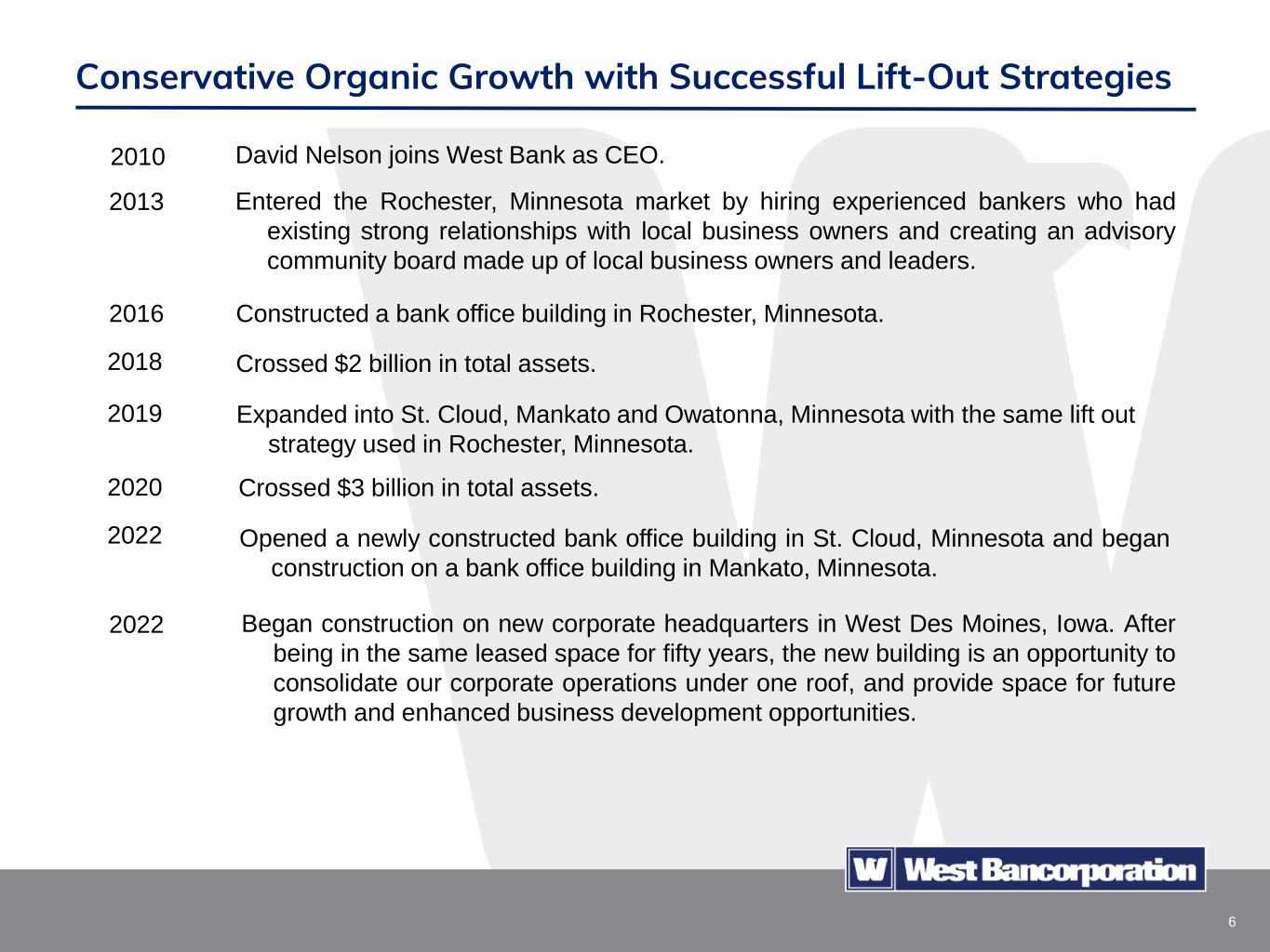 5 Experienced Executive Leadership David D. Nelson Director/Chief Executive Officer/President Joined West Bank in 2010 Years in Banking: 40 Prior to joining the Company Mr. Nelson was the President of Southeast Minnesota Business Banking and President of Wells Fargo Bank Rochester in Rochester, Minnesota. Harlee N. Olafson Chief Risk Officer/Executive Vice President Joined West Bank in 2010 Years in Banking: 45 Prior to joining the Company Mr. Olafson was the President of Southwest Minnesota Business Banking and President of Wells Fargo Bank Mankato in Mankato, Minnesota. Bradley P. Peters Executive Vice President West Bank Minnesota Group President Joined West Bank in 2019 Years in Banking: 38 Prior to joining the Company Mr. Peters was the Executive Vice President of Bremer Bank in Minnesota where he was responsible for new market expansion. Jane M. Funk Chief Financial Officer Executive Vice President/Treasurer Joined West Bank in 2014 Years in Banking & Public Accounting: 33 Ms. Funk has extensive experience in the community banking industry and public accounting. Brad L. Winterbottom Executive Vice President West Bank President Joined West Bank in 1992 Years in Banking: 43 Mr. Winterbottom has extensive experience in commercial lending and loan portfolio administration and knowledge of the Iowa business community. Todd A. Mather West Bank Chief Credit Officer Joined West Bank in 2019 Years in Banking: 27 Prior to joining West Bank, Mr. Mather spent 8 years at Bremer Bank in Minnesota as a Senior Credit Director and Group Senior Credit Manager.