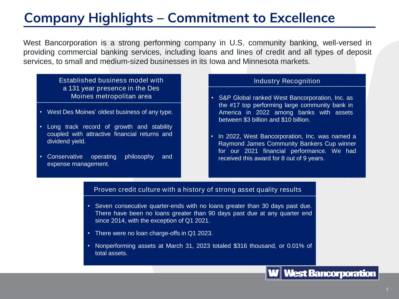 6 Conservative Organic Growth with Successful Lift-Out Strategies 2010 2013 2016 2018 2019 2020 2022 2022 Began construction on new corporate headquarters in West Des Moines, Iowa. After being in the same leased space for fifty years, the new building is an opportunity to consolidate our corporate operations under one roof, and provide space for future growth and enhanced business development opportunities. Opened a newly constructed bank office building in St. Cloud, Minnesota and began construction on a bank office building in Mankato, Minnesota. Crossed $3 billion in total assets. Expanded into St. Cloud, Mankato and Owatonna, Minnesota with the same lift out strategy used in Rochester, Minnesota. Crossed $2 billion in total assets. Constructed a bank office building in Rochester, Minnesota. Entered the Rochester, Minnesota market by hiring experienced bankers who had existing strong relationships with local business owners and creating an advisory community board made up of local business owners and leaders. David Nelson joins West Bank as CEO.