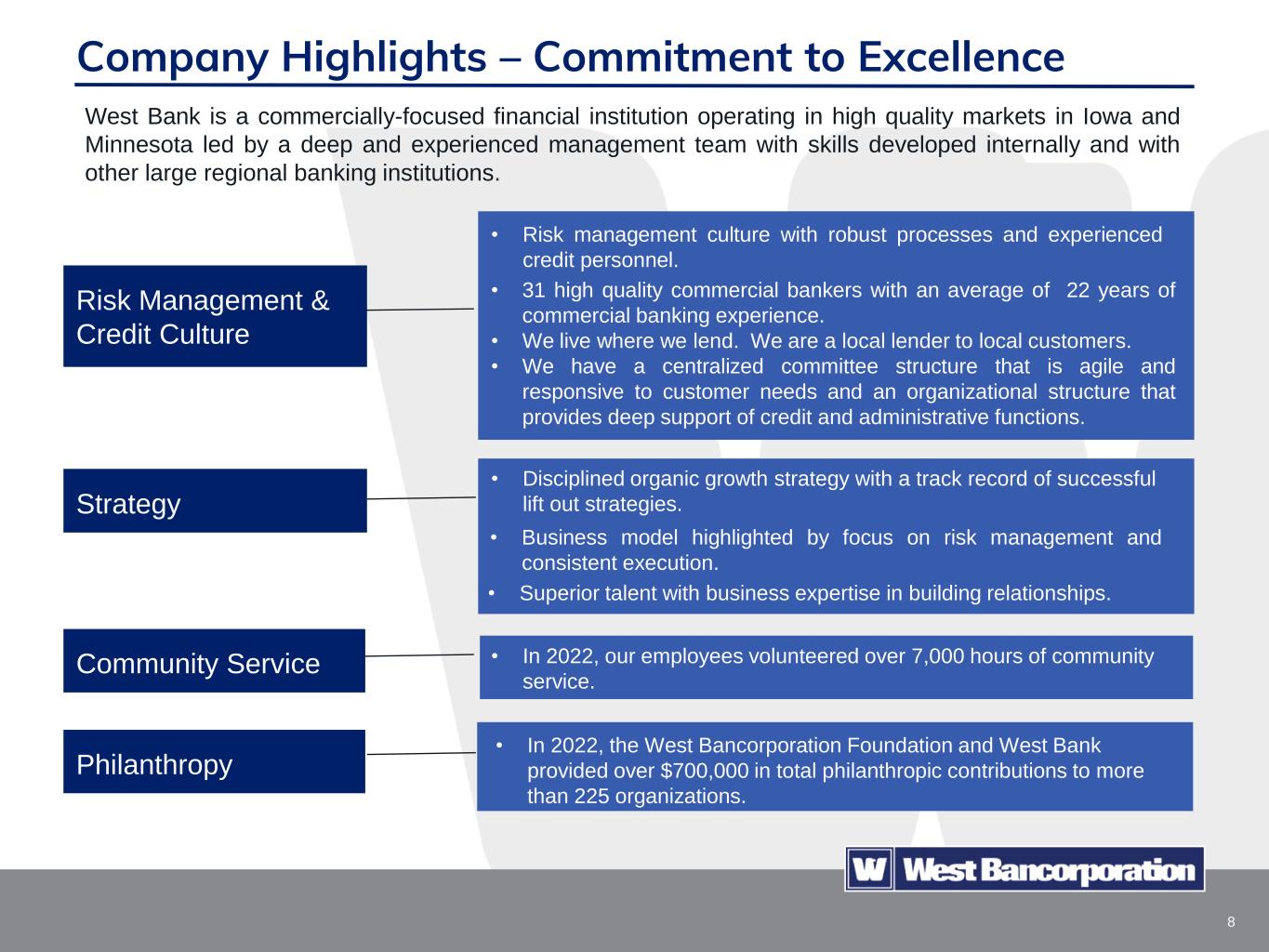 7 Company Highlights – Commitment to Excellence West Bancorporation is a strong performing company in U.S. community banking, well-versed in providing commercial banking services, including loans and lines of credit and all types of deposit services, to small and medium-sized businesses in its Iowa and Minnesota markets. Established business model with a 131 year presence in the Des Moines metropolitan area Industry Recognition Proven credit culture with a history of strong asset quality results • In 2022, West Bancorporation, Inc. was named a Raymond James Community Bankers Cup winner for our 2021 financial performance. We had received this award for 8 out of 9 years. • S&P Global ranked West Bancorporation, Inc. as the #17 top performing large community bank in America in 2022 among banks with assets between $3 billion and $10 billion. • Seven consecutive quarter-ends with no loans greater than 30 days past due. There have been no loans greater than 90 days past due at any quarter end since 2014, with the exception of Q1 2021. • There were no loan charge-offs in Q1 2023. • Nonperforming assets at March 31, 2023 totaled $316 thousand, or 0.01% of total assets. • West Des Moines’ oldest business of any type. • Long track record of growth and stability coupled with attractive financial returns and dividend yield. • Conservative operating philosophy and expense management.