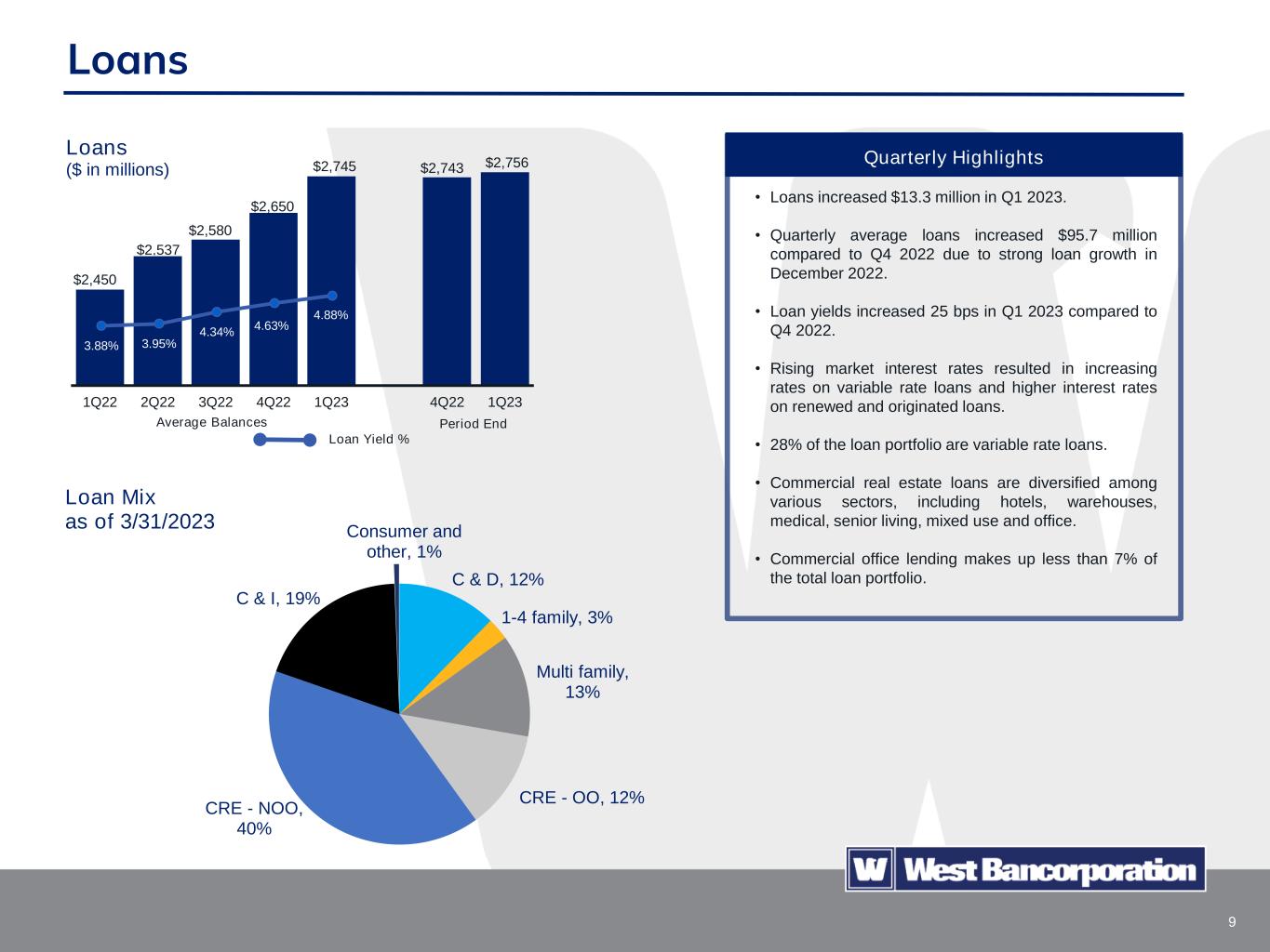 8 Company Highlights – Commitment to Excellence West Bank is a commercially-focused financial institution operating in high quality markets in Iowa and Minnesota led by a deep and experienced management team with skills developed internally and with other large regional banking institutions. Risk Management & Credit Culture Philanthropy Community Service Strategy • 31 high quality commercial bankers with an average of 22 years of commercial banking experience. • We live where we lend. We are a local lender to local customers. • We have a centralized committee structure that is agile and responsive to customer needs and an organizational structure that provides deep support of credit and administrative functions. • Business model highlighted by focus on risk management and consistent execution. • Superior talent with business expertise in building relationships. • Disciplined organic growth strategy with a track record of successful lift out strategies. • In 2022, our employees volunteered over 7,000 hours of community service. • In 2022, the West Bancorporation Foundation and West Bank provided over $700,000 in total philanthropic contributions to more than 225 organizations. • Risk management culture with robust processes and experienced credit personnel.
