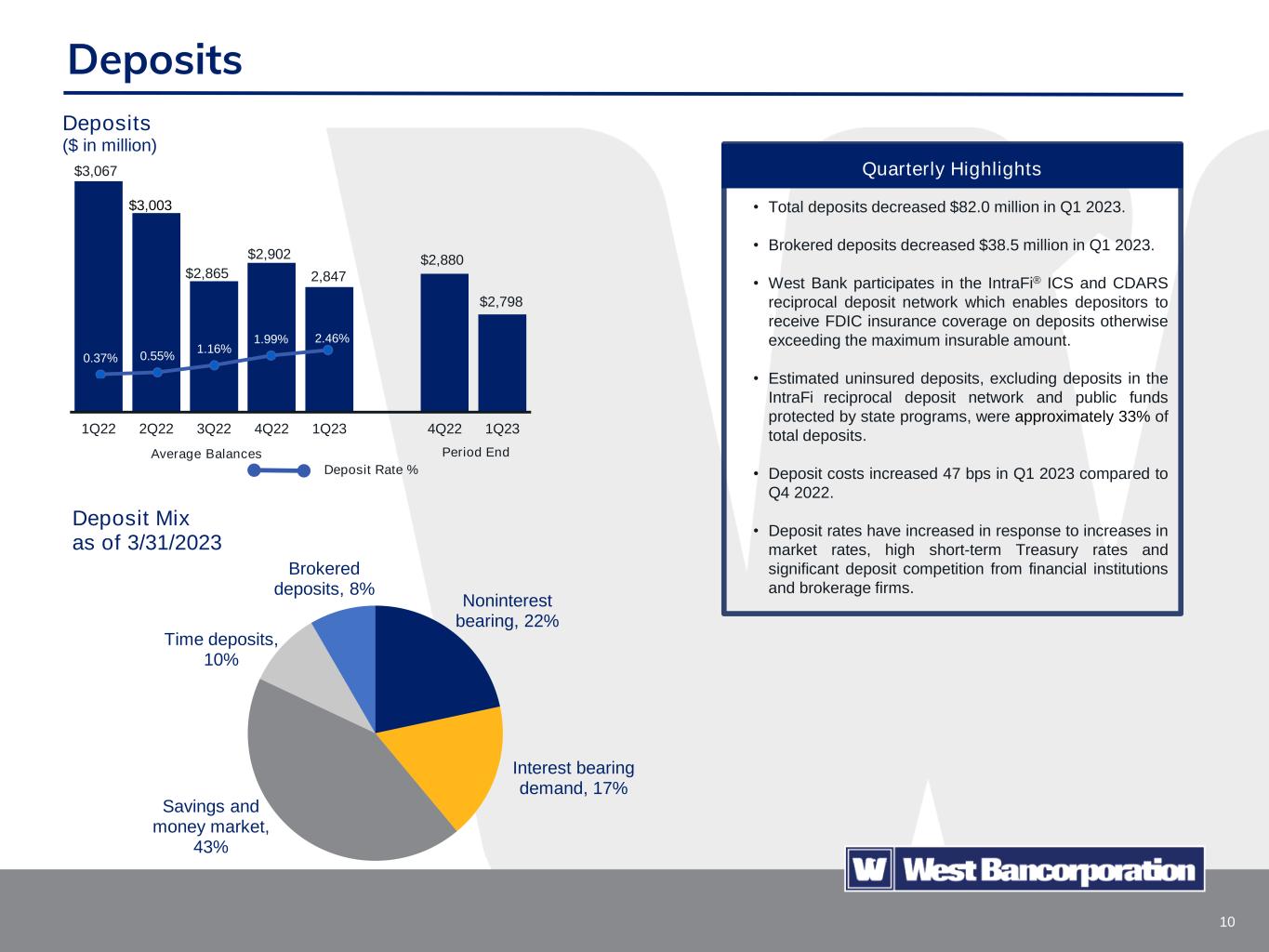 9 C & D, 12% 1-4 family, 3% Multi family, 13% CRE - OO, 12% CRE - NOO, 40% C & I, 19% Consumer and other, 1% Loan Mix as of 3/31/2023 Loans $2,450 $2,537 $2,580 $2,650 $2,745 $2,743 $2,756 1Q22 2Q22 3Q22 4Q22 1Q23 4Q22 1Q23 Loans ($ in millions) Period End Loan Yield % Average Balances 3.88% 3.95% 4.34% 4.63% 4.88% Quarterly Highlights • Loans increased $13.3 million in Q1 2023. • Quarterly average loans increased $95.7 million compared to Q4 2022 due to strong loan growth in December 2022. • Loan yields increased 25 bps in Q1 2023 compared to Q4 2022. • Rising market interest rates resulted in increasing rates on variable rate loans and higher interest rates on renewed and originated loans. • 28% of the loan portfolio are variable rate loans. • Commercial real estate loans are diversified among various sectors, including hotels, warehouses, medical, senior living, mixed use and office. • Commercial office lending makes up less than 7% of the total loan portfolio.