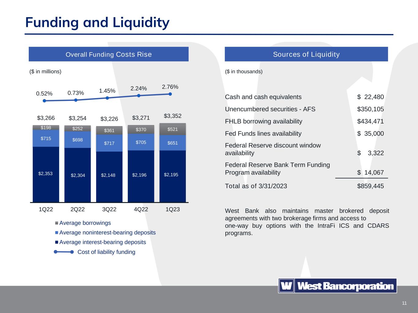10 Noninterest bearing, 22% Interest bearing demand, 17% Savings and money market, 43% Time deposits, 10% Brokered deposits, 8% Deposit Mix as of 3/31/2023 Deposits $3,067 $3,003 $2,865 $2,902 2,847 $2,880 $2,798 1Q22 2Q22 3Q22 4Q22 1Q23 4Q22 1Q23 Deposits ($ in million) • Total deposits decreased $82.0 million in Q1 2023. • Brokered deposits decreased $38.5 million in Q1 2023. • West Bank participates in the IntraFi® ICS and CDARS reciprocal deposit network which enables depositors to receive FDIC insurance coverage on deposits otherwise exceeding the maximum insurable amount. • Estimated uninsured deposits, excluding deposits in the IntraFi reciprocal deposit network and public funds protected by state programs, were approximately 33% of total deposits. • Deposit costs increased 47 bps in Q1 2023 compared to Q4 2022. • Deposit rates have increased in response to increases in market rates, high short-term Treasury rates and significant deposit competition from financial institutions and brokerage firms. Period EndAverage Balances Deposit Rate % 0.37% 0.55% 1.16% 1.99% 2.46% Quarterly Highlights