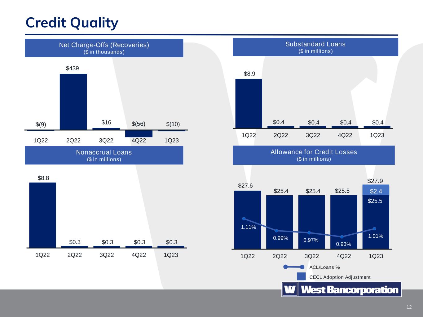 11 Funding and Liquidity $2,353 $2,304 $2,148 $2,196 $2,195 $715 $698 $717 $705 $651 $198 $252 $361 $370 $521 $3,266 $3,254 $3,226 $3,271 $3,352 1Q22 2Q22 3Q22 4Q22 1Q23 Average borrowings Average noninterest-bearing deposits Average interest-bearing deposits Sources of LiquidityOverall Funding Costs Rise 0.52% 0.73% 1.45% 2.24% 2.76% Cost of liability funding ($ in thousands) Cash and cash equivalents $ 22,480 Unencumbered securities - AFS $350,105 FHLB borrowing availability $434,471 Fed Funds lines availability $ 35,000 Federal Reserve discount window availability $ 3,322 Federal Reserve Bank Term Funding Program availability $ 14,067 Total as of 3/31/2023 $859,445 ($ in millions) West Bank also maintains master brokered deposit agreements with two brokerage firms and access to one-way buy options with the IntraFi ICS and CDARS programs.