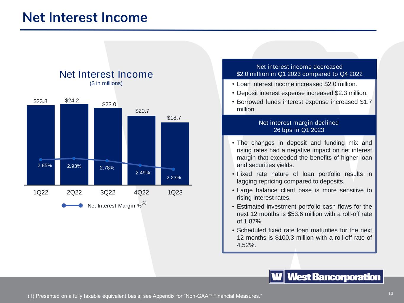 12 Credit Quality $(9) $439 $16 $(56) $(10) 1Q22 2Q22 3Q22 4Q22 1Q23 $8.9 $0.4 $0.4 $0.4 $0.4 1Q22 2Q22 3Q22 4Q22 1Q23 $8.8 $0.3 $0.3 $0.3 $0.3 1Q22 2Q22 3Q22 4Q22 1Q23 $27.6 $25.4 $25.4 $25.5 $25.5 1Q22 2Q22 3Q22 4Q22 1Q23 $2.4 ACL/Loans % Nonaccrual Loans ($ in millions) Net Charge-Offs (Recoveries) ($ in thousands) Substandard Loans ($ in millions) Allowance for Credit Losses ($ in millions) 1.11% 0.99% 0.97% 0.93% 1.01% $27.9 CECL Adoption Adjustment